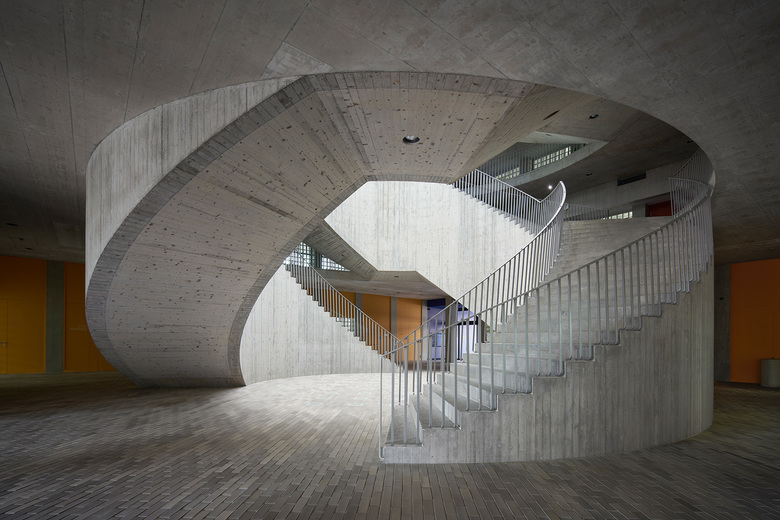 Typologisch handelt es sich um ein auf sich bezogenes, fast tempelartiges Gebäude, das etwas Ruhe in die Heterogenität der Umgebung bringt. Die Grundstruktur ist einfach, bestehend aus zwei konzentrischen Ringen mit vorfabrizierten Betonstützen und einer expressiven, mittigen Treppenanlage. Der repetitive Aufbau und Vorfabrikation ermöglichen eine effiziente und schnelle Umsetzung, ein nicht unwesentlicher Aspekt hinsichtlich der knappen Raumverhältnisse und des engen Zeitplans zur Realisation des Bauvorhabens während laufendem Schulbetrieb.