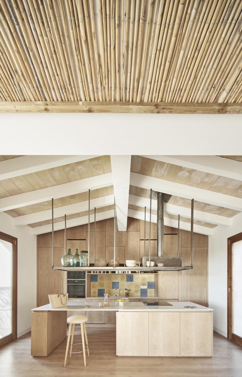 Transversalmente, la pastilla se perfora mediante un prisma imaginario obteniendo un gran hueco central, el salón-comedor. La huella del prisma queda reflejada en suelo y techo. En el suelo una lengua de hormigón crea terrazas a ambos lados del salón, ampliándolo y conectándolo con el paisaje. En el techo, una pérgola de cañizo atraviesa el hueco y sobresale por ambos lados. De esta manera las terrazas quedan protegidas del sol, y el cañizo filtra la luz creando un juego de luces y sombras típico de la arquitectura mediterránea. El salón-comedor puede ser interior o exterior gracias a unas ventanas correderas que pueden esconderse totalmente en la fachada.