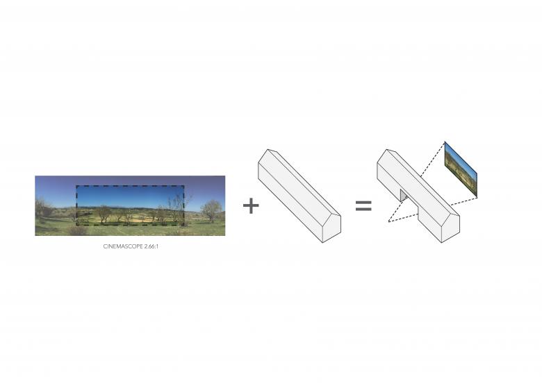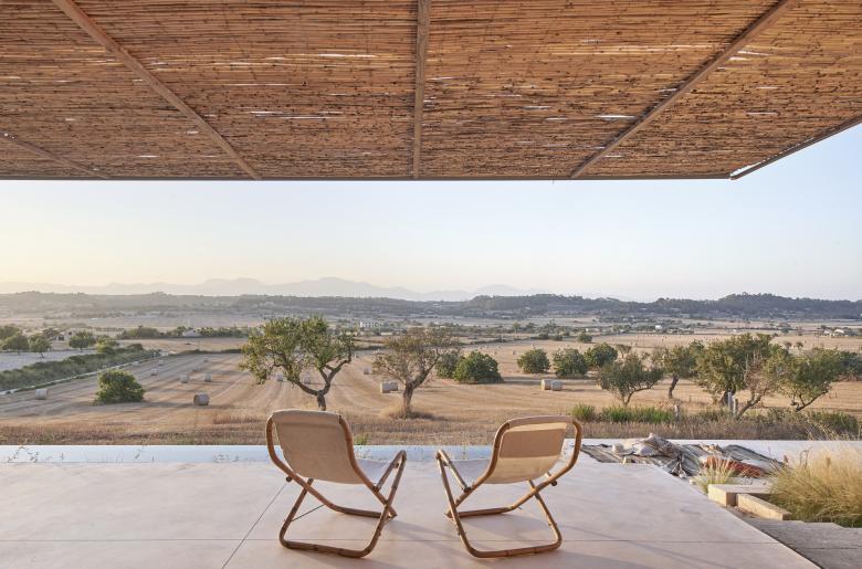 En la terraza sur la lengua de hormigón finaliza con un banco corrido de marés (piedra autóctona) desde el que se observa el paisaje enmarcado a través del gran hueco como si de una pantalla de cine se tratase ya que la proporción del hueco se asemeja a la del antiguo Cinemascope 2.66:1. Por el contrario a norte la terraza funciona como un podio (sobre el aljibe que recoge el agua de lluvia) para contemplar las vistas y la piscina que se encuentra en una plataforma paralela a la casa en un nivel más bajo.