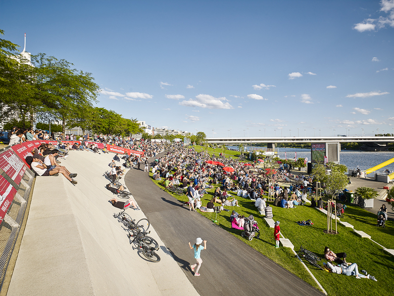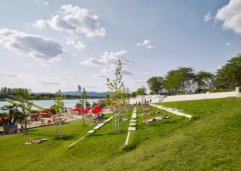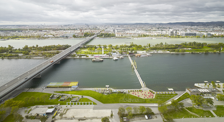 Die Landschaft schafft hochwertige Bereiche als „Place-Maker“, Orte die in ihrer prägenden Struktur den Raum geben für spezifische und im Alltag wechselnde Nutzungen. Die wesentlichen Anlagen für die Nutzungen von Plaza, Beach und Sport sind formal und funktional integriert. Durch diese Integration der Kernfunktionen in die neue Topografie und die wechselhafte Anordnung der Bebauungsflächen werden großzügige Blickbezüge zur Donau geschaffen. Zur Uferkante schräg gestellte Baufluchten und die Höhenentwicklung des Ufergeländes erweitern zusätzlich den Bezug zum Wasser.
