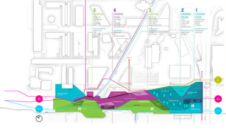 Die Zonierung der Copa Gagrana von City Richtung Wasser orientiert sich sowohl am Verhalten als auch an den Erwartungen eines Stadtbenützers und entspricht zugleich den Anforderungen des Hochwasserschutzes. Die Einteilung umfasst drei Zonen: Die Zone C sieht eine sparsame Bebauung mit öffentlichen Gebäuden und Sonderwohnformen vor (z.B.: Studentisches Wohnen). Diese Widmung schafft einen fließenden Übergang zwischen Uferzone und Donaucity. Die Fabela Promenade wird dadurch als zentrale Erschließung Richtung Donaucity gestärkt und mündet an ihrem Ende in Zone B auf die Plaza. Diese Zone nimmt die obere Haupterschließungsachse mit Plaza, Radweg und Anlieferungszone auf, über welche sämtliche permanente Einrichtungen, wie wintertaugliche Gastronomiebetriebe und der Fahrradverleih, erschlossen werden. Die angehobene Situation bietet Schutz vor Hochwasser und durch den freien Blick auf die Uferzone eine optimale Voraussetzung für einen qualitätsvollen Restaurantbetrieb. Dieser Bereich ist als Grünzone mit einer Vielzahl an Bäumen insbesondere im Bereich der Plaza und als Allee entlang des Radweges konzipiert. Die Uferzone – Zone A ist der Badebereich der Copa Cagrana. Liegeflächen, Umkleideräume und Sanitäranlagen werden in die Topographie integriert. Angrenzend an den Liegebereich ist eine großzügige Strandbar vorgesehen. Identität und Gestaltung sollen sich auf Basis der formulierten Qualitätsvorstellungen entwickeln können. Die Erschließung der Zone erfolgt über die „entschleunigte“ Uferpromenade, die als Flaniermeile vorwiegend für Fußgänger attraktiv gemacht werden soll.