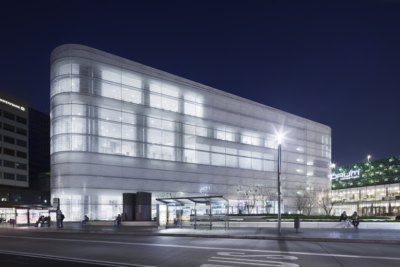 Forum Mittelrhein – Das Center stellt sich als flächiger, horizontal gegliederter Baukörper dar. Mit dieser starken Gliederung wird das Gebäudevolumen reduziert und eine angenehme Maßstäblichkeit erzeugt. An relevanten Anknüpfungspunkten in das Stadtgefüge liegen großzügige Eingänge. Die Ladenstraße mit dem trapezförmigen Grundriss und den fließenden Konturen wird durch die Lufträume der fünf „Tubes“ gegliedert, die Orientierungspunkte bilden, und den Innenraum mit Tageslicht versorgen. Über den Verkaufsgeschossen sind die Nebenflächen sowie ca. 740 Parkplätze, die um einen zentralen, begrünten Innenhof organisiert. Die Glasfassade von Erdgeschoss und erstem Obergeschoss mit den stehenden Formaten und den plastisch ausgebildeten Deckschalen der Fassadenpfosten erhält eine starke, vertikale Gliederung. Der dreigeschossige Aufbau wird durch die artifizielle „Weinlaubfassade“ geprägt. Grundlage der Struktur bildet das abstrahierte Bild einer Weinpflanze, die als 3D-Form frei interpretiert wird. Die gesamte Fassadenbekleidung erfolgt mit nur einem einzigen Element, das in einem industriellen Prozess im Tiefziehverfahren produziert wurde.