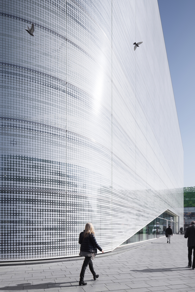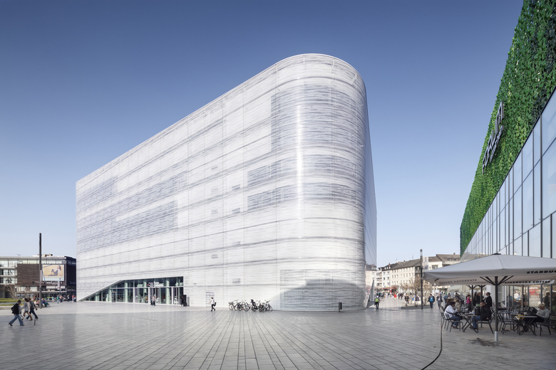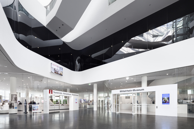 Kulturbau – Im Kulturbau werden die Stadtbibliothek, das Mittelrhein-Museum sowie die Koblenz Touristik mit ihrem Zentrum der Rheinromantik mit dem Ziel der Synergiegewinnung in einem Haus zusammengeführt. Das Gebäude steht als freier Körper auf dem neuen Zentralplatz und bildet durch seinen Solitärcharakter, seine Fassadengestaltung und die bewusste Überhöhung im Stadtgefüge eine Landmarke. Es besitzt eine hohe Durchlässigkeit für Besucher: das zentrale Foyer wird von allen drei Seiten aus dem umgebenden Stadtraum erschlossen und wird auf diese Weise Teil des städtischen Gefüges. Im offenen Erdgeschoß verfügen die drei Nutzer jeweils über einen eigenen Antritt. Über die prominenten Erschließungselemente der Wendeltreppen (Museum und Touristik) sowie der Rolltreppe (Bibliothek) werden die Nutzungen erschlossen. Oberhalb der gemeinsamen Erdgeschoßzone überlagern sich die unterschiedlichen Funktionen geschossweise. Die Dauerausstellung des Mittelrhein-Museums nimmt das erste Obergeschoss ein. Die Bibliothek sitzt auf den Geschossen zwei, vier und fünf mit direktem Austritt auf die Dachterrasse. Der 30m hohe Luftraum verbindet die Nutzungen vertikal, bringt Tageslicht in das Gebäudeinnere und bietet vielfältige Durchblicke. Im Untergeschoß befinden sich der Wechselausstellungsbereich des Mittelrhein-Museums, das Zentrum der Rheinromantik, sowie Nebenflächen. Das Gebäude besitzt eine Doppelfassade aus außenseitig weiß siebbedrucktem Glas, die das Haus wie eine zweite Haut umspannt und dem Körper eine matte und edle Anmutung verleiht. Durch die Bedruckung werden Blicke nach draußen „gefiltert“ und das Innenleben des Körpers sowie Wechsel aus offenen und geschlossenen Bereichen von außen subtil erlebbar. Im Bereich der Zugänge ist die Außenfassade jeweils großzügig ausgeschnitten und gibt direkte Einblicke in das Foyer und die Antrittsbereiche frei.