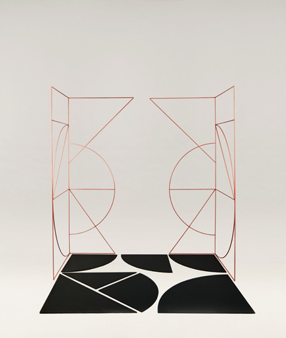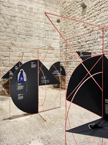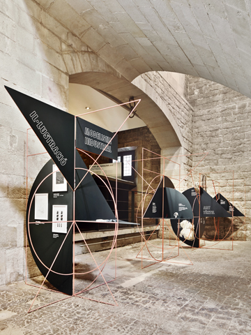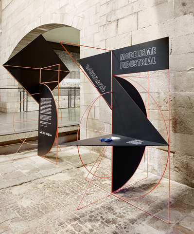 The project, first assembled at the Maritime Museum of Barcelona, is a modular and reusable display system designed for Massana School of Art and Design. The design needed to be self-supporting, easily transportable, flexible and adaptable to different contexts and contents. Therefore, the system is defined by a minimum steel structure that acts both as a support and a guide to configure different spaces and display different exhibition contents. The metal structure configures the minimum that defines a space: a corner. The corner allows an almost infinite combination defining multiple possible exhibition spaces. Since zigzag walls, unidirectional, crosses or complete “rooms”. The proportion and the composition of the metal wireframe follow DIN formats commonly used by students, standardized size, A2, A3, etc. Structure’s rods are very thin, 8mm thick, lightening its weight for easy transport and assembly. To ensure system stability, the rods are braced among them compensating its thinness. The structure is perforated thus allowing using mechanical fasteners to hold any type of item. The color of the structure is mutable being able to repaint it as required. On the occasion of the exhibition held at the Maritime Museum of Barcelona, where students works where presented, 5mm DM panels lacquered acted as support of the objects and images that needed to be displayed. For the occasion the structure was painted pink and panels dark gray to highlight the display from existing stone walls.