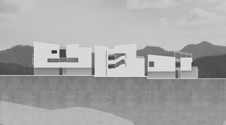 岐院由三栋单体建筑展开排成一列,与景观平行的线性布局,旨在最大化内部空间与前方山水的视线接触。关于环境与建筑二者的关系,我们并不希望这一设计被掩埋在密林之中,而是以建筑的姿态与环境对话、互诉,使建筑空间与人造环境、自然环境几者间得以达成某种微妙的动态平衡。建筑主界面像是一字排开错落的几块大积木,我们把不同类型的客房空间归纳在最简洁的体块中,突出秩序感。