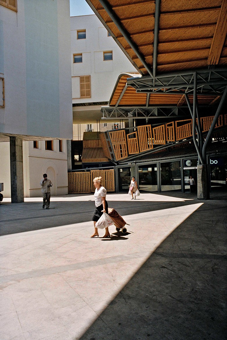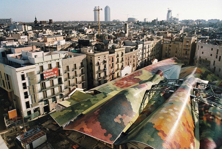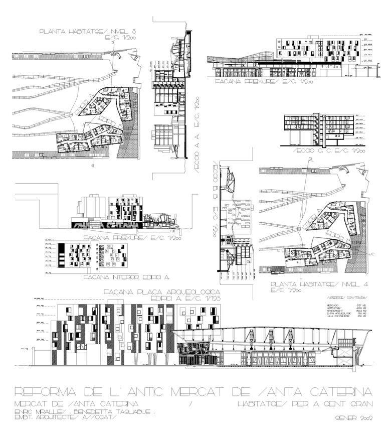 A competition was opened to restore the Santa Caterina city market located in the old quarter of Barcelona in 1997. EMBT won the bid with a proposal that aimed at incorporating the extreme complexity of the setting itself by creating a commercial market complemented by a residential zone and public spaces that integrated all the activities of the neighborhood. The project maintains parts of the existing structure and the architects proposed a new and creative render of the area which respected the history and context of the site. The proposal superimposes new architecture on old, mixes them, and comes up with a conglomerate, a hybrid that accentuates usefulness and is contemporary. The interior distribution of the market was reorganized; there are fewer stands but the access and service systems are rationalized; the surface area of public spaces gains ground and communicates with the Avinguda Francesc Cambó, an important transitional vein in the neighborhood also surrounded by a dense network of narrow streets