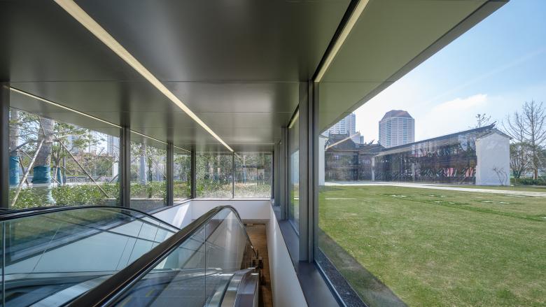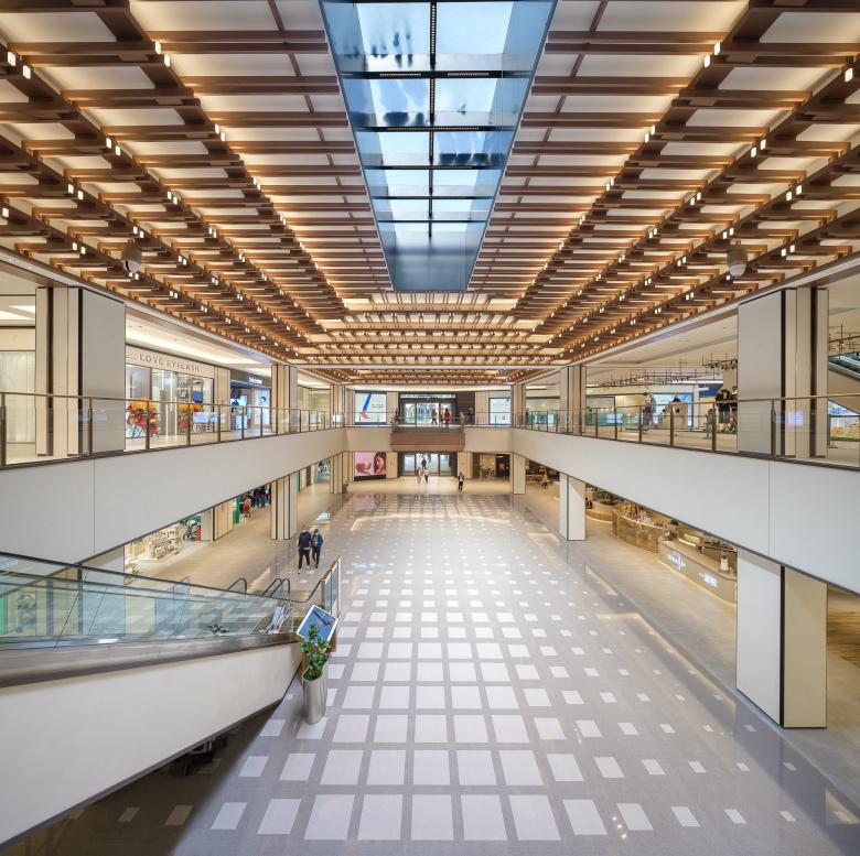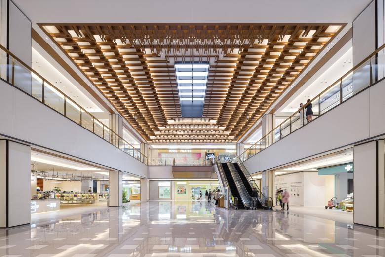 Inside the mall, two enclosed areas have been designed to physically and visually connect with the site’s significant culture heritage, Shenyu Li and Thean Hou Temple. The commercial space located directly below is succinctly integrated with the historic heritage on the ground floor and compactly locates the entrance, axis and underground public atrium. Kokaistudios' interior design team extracted elements from the structure of the traditional lilong house and apply these to the design. The combination of the glass roof windows and the lightweight wooden rafters ceiling recalled the memory of history. Designed as “a dialogue between commercial and heritage”, they integrate the conservation building with the commercial public space as a spatial technology.