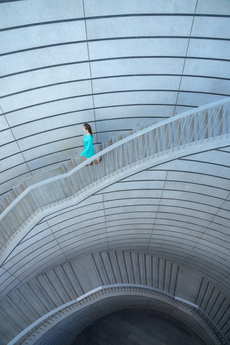 The pebble-shaped openings incorporate entrances to the underground commercial space, and are located either side of the bisecting road. Partially planted and with occasional seating areas along their route, as well as coffeeshops, they recall the gentle slopes of a valley or stepped tea fields. With escalators alongside for accessibility, entrances merge with the surrounding landscape, with only their canopies visible from the green land above. Another entrance is via the new four-floor commercial building. The structure is located next to the office tower, aesthetically uniting the site's recent phases of development through materials.