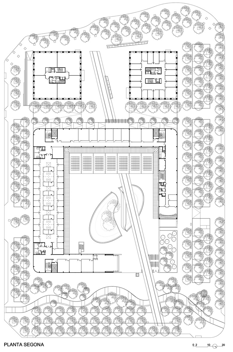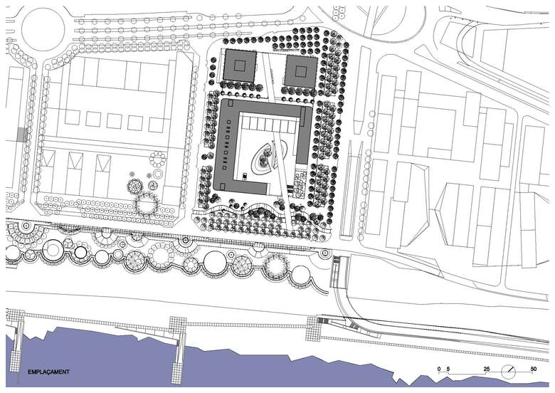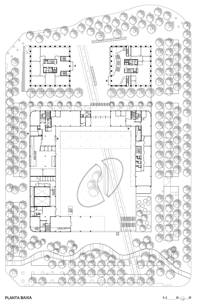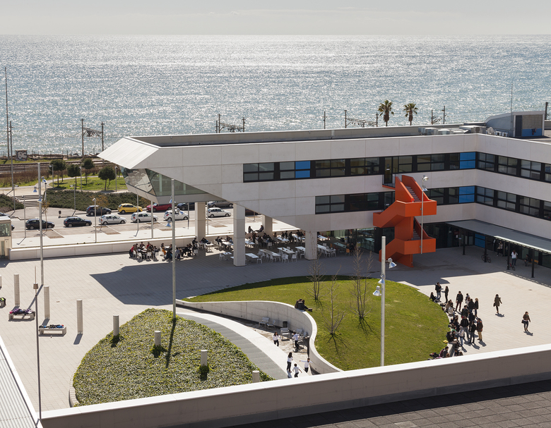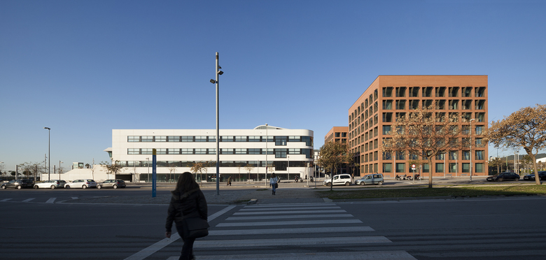 The Tecnocampus of Mataró is a large university complex of 47.418 m2 that combines academic centres, centres for research and knowledge together with a nursery for I+T Industries, located on the Mediterranean coast near the city of Barcelona. The urban university, since the early medieval times, has been based on the monastic court. A form that not only gathered the buildings together but also allowed the transversal questioning of the different knowledge that they housed. This cross fertilization made research universal which the form encouraged. The town council of Mataró responded to the changes required by the local industry by joining forces to create this technical university open not only to challenge current practice but also to gain the knowledge to create new products and services to ensure employment opportunities for the future. This implied a combination of learning spaces and nursery business accommodation. The urban architectural response organized the complex as follows. In the north the two cubic brick buildings, oriented to the city and destined for administration, business nursery and auditorium, formalizes the entrance to the university patio. In the south, there is the academic and research building with the white clad university public square, which closes on itself and partially opens to the Mediterranean Sea. The repetitive windows of the brick cubes have deep reveals that contain the structural rim, the vertical services and air-conditioning, while the openings themselves combine natural ventilation for at least half a year through balcony doors. These windows follow the classical composition with the vocabulary of base, column and cornice, reinterpreted by tilting the glazing of the lower floor and the last two upper floors that reflect the light of the sky and the street respectively. The strip windows and glass-fibre reinforced concrete panels of the university court express a nautical air next to the sea and at the same time allow a flexible internal distribution of the different departments. A diagonal pergola provides a graphic link between the forecourt, the university court and the opening to the sea. Is it also an indication that all universities should be urban again, linking the knowledge of the industrial and merchant city with the centres of learning and investigation?