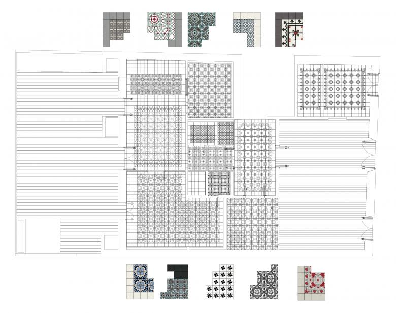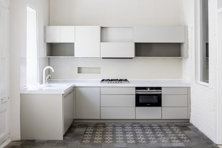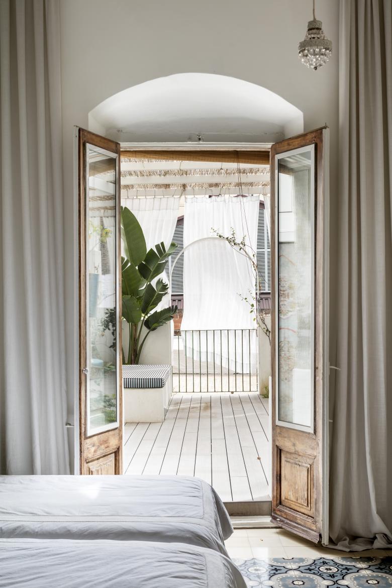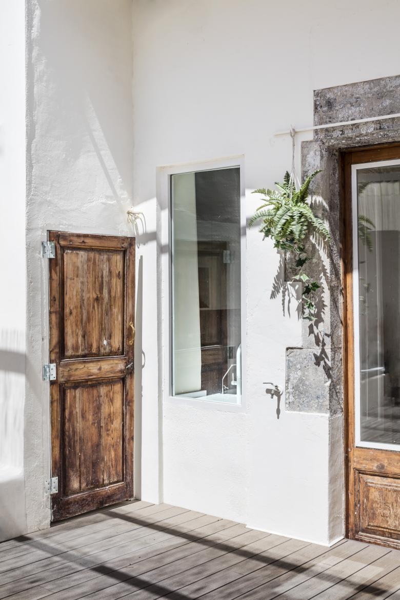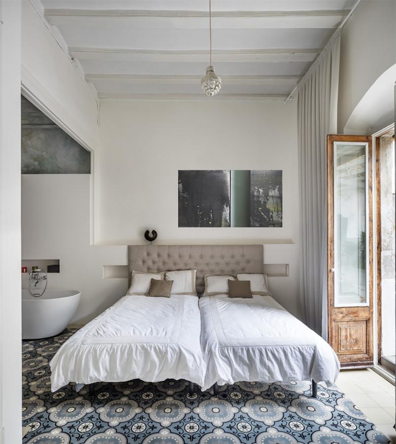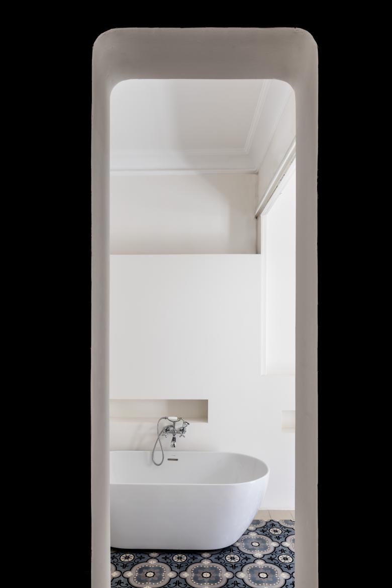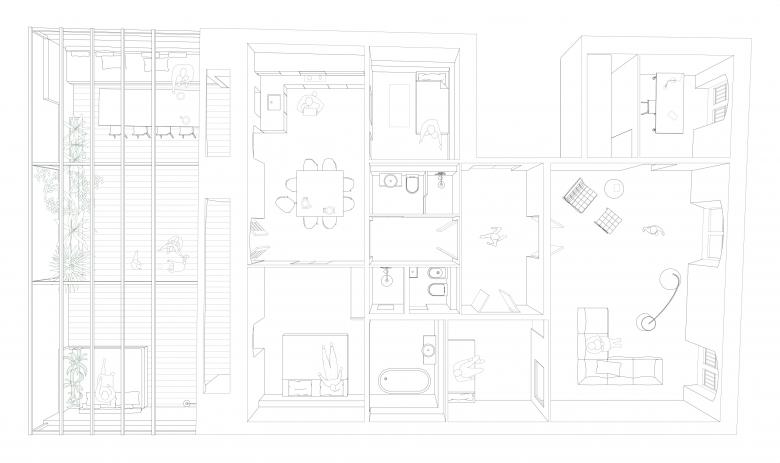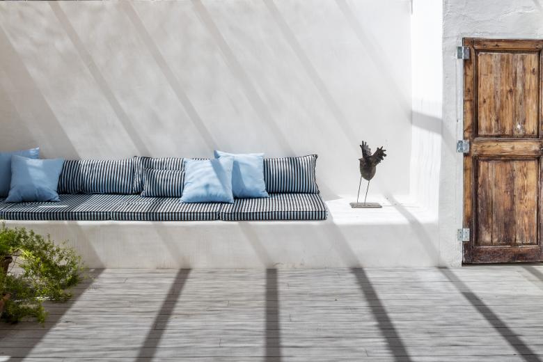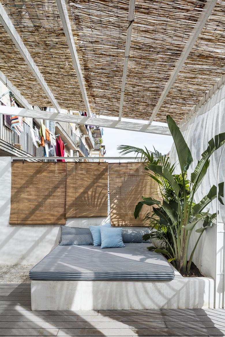 The old traditional hydraulic floor tiles have been carefully restored and complemented in some areas of the rooms, like colourful rugs. The new elements (in the kitchen and bathrooms) and the walls subtly pick up the colours of the floor tiles. The large terrace is conceived as an extension of the apartment, generously expanding its boundaries. The white benches with lime plaster finish and the pergola are reminiscent of traditional mediterranean courtyards.
