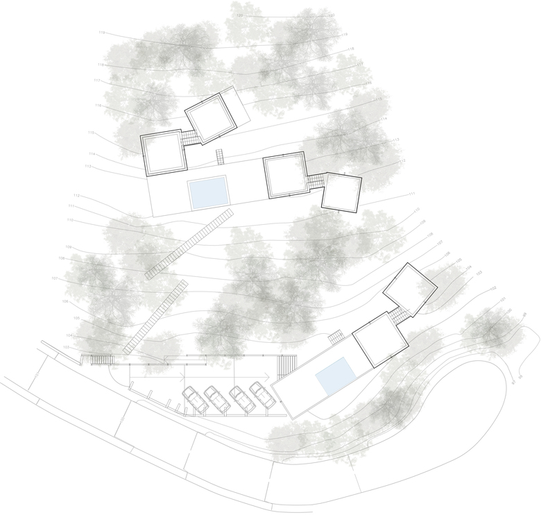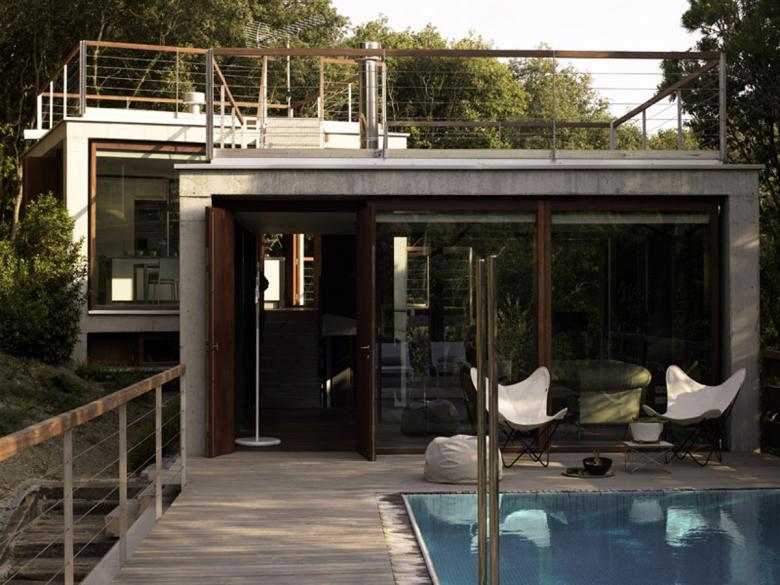 The house is structured with two-story modules, roughly 5.5 x 5.5 meters in size, which are articulated and connected at mid-height by stairs, adapting to the uneven terrain and leaving part of the house semi-buried for natural thermal insulation. The upper floor houses the living room, linked to the terrace where the pool is located – oriented to provide a distant view of the sea above the trees. Another module, half a floor higher, contains the dining area and kitchen. The lower levels, immersed in the forest, house the bedrooms.