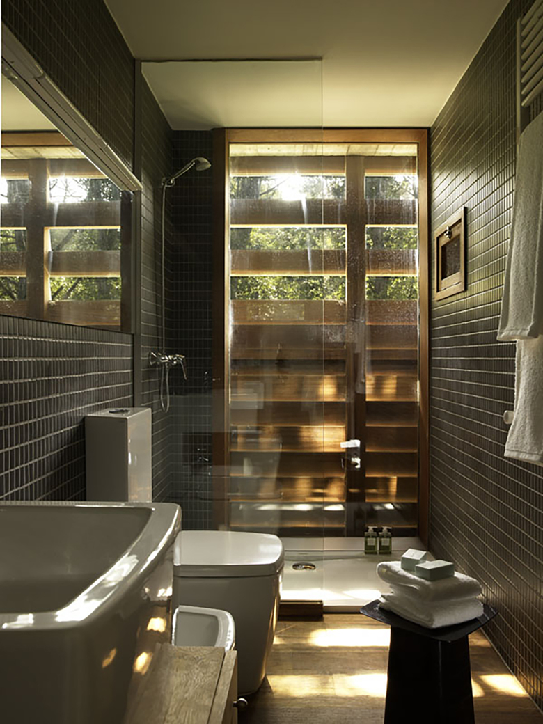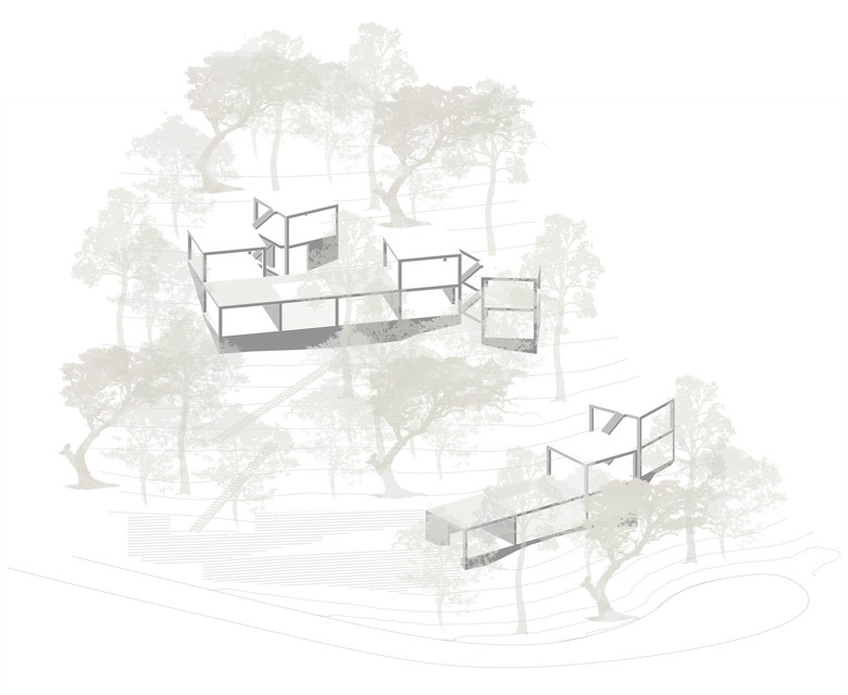 Regarding materials, the enclosures are primarily wood and glass. The joineries, made of iroko on the exterior and painted MDF on the interior, are designed to allow for installations, as many spaces lack walls for embedding them. Interiors are organized and separated by plasterboard partitions, and they feature iroko wood flooring. The reinforced concrete structure appears on the lower floor as authentic walls, occasionally replaced by pillars or specific support points. In contrast, on the upper floors, any trace of a solid and immovable structural system disappears in favor of limited supports or vertical supports that choose to be positioned at the vertices of the volumetric cubes, to disturb the exceptional view as little as possible. In the pursuit of this effect, one of the peculiarities of the facade is the absence of external sunshades on the windows, replaced by light blinds. Another notable detail is the occasional appearance of wooden slats on certain sections of the facade. Thus, the all-powerful presence of concrete is forsaken, opting for a kind of lattice that introduces, into the interiors it protects, a surprising luminous effect of threads of sunlight and shadow.