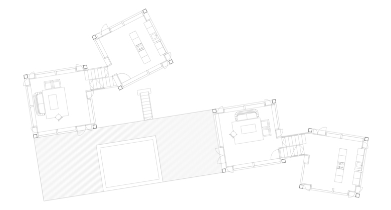 The living room highlights two fundamental elements in its exceptional configuration. Firstly, the arrangement of all furniture around the fireplace, resembling a kind of devotional altar. This element takes on the appearance of a structural support, widened only occasionally to accommodate the fire, ensuring the comfort of the inhabitants during low temperatures. Secondly, the direct connection to the outdoor terrace where the pool is situated; an extremely versatile space for various activities such as gatherings, relaxation, sunbathing, or even outdoor dining. The enjoyment of outdoor space is not limited to this terrace, as all the roofs of the complex are bordered by railings, serving not only their usual protective function but also becoming transit areas or viewpoints for the pleasure of the residents.