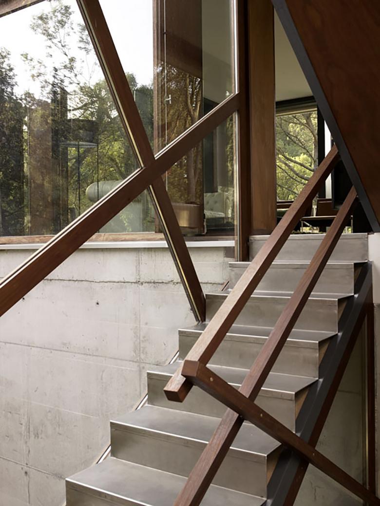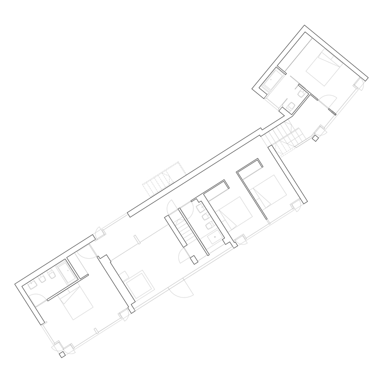 The two distinct modules relate through the movement of the pieces, namely, through the main staircase, which, like a lighthouse, guides all internal movement. With a simple and direct language, in successive sections, the staircase is accompanied by an original railing in the form of a St. Andrew's Cross, a figure that, according to ancient tradition, represents humility and suffering. A subtle gesture that introduces a surprising poetic note into an apparently prosaic architectural element. As mentioned earlier, the entire program is accommodated on two floors or four half-floors due to the sloping floors. There are four double bedrooms, two of them as suites with all the services and comforts that the concept entails: Three of the four bedrooms are located on the lowest level, almost anchored to the surface of the terrain.