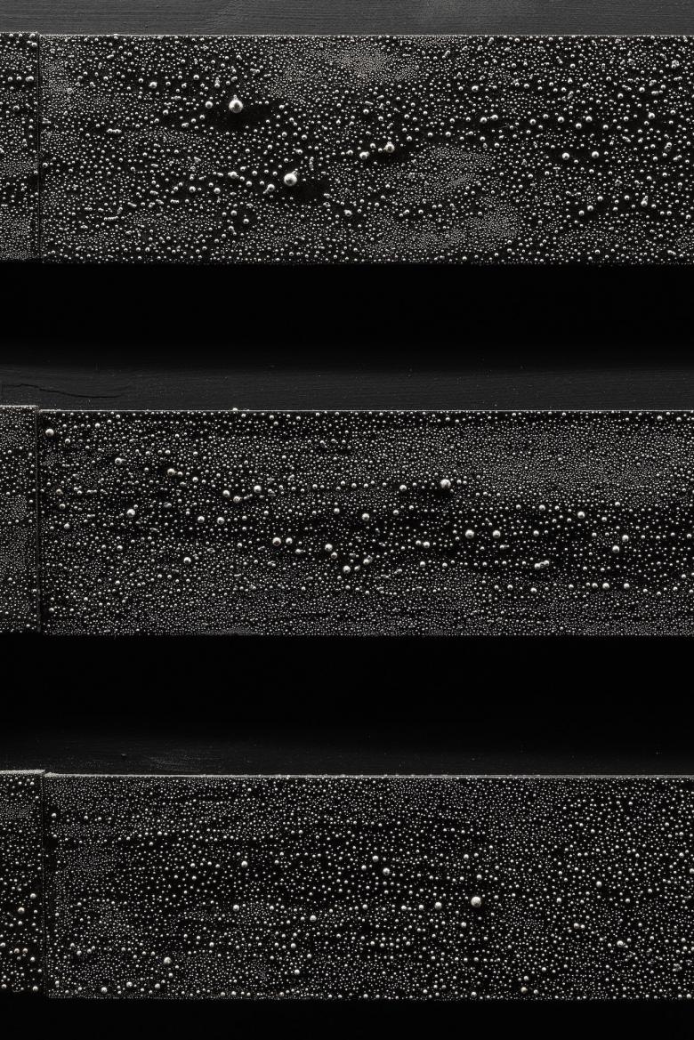 そして近藤高弘氏の技法である銀滴彩をあしらった横幅7mを超える平面作品を空間のメインに据えた。暗がりの中でこの銀の滴りが浮かびあがることで、この地の水に纏わる流れ、滴、潤いや艶などを陶器の世界の中で感じてもらうことを目指した。