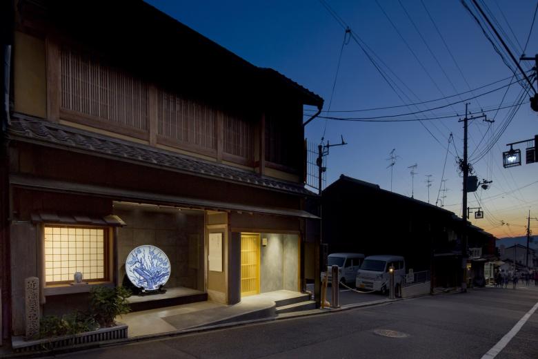 ① これまで広く公開されていなかった悠三氏の最大級の作品である梅染付大皿を茶わん坂の通りから誰でも見ることができるエントランススペース。