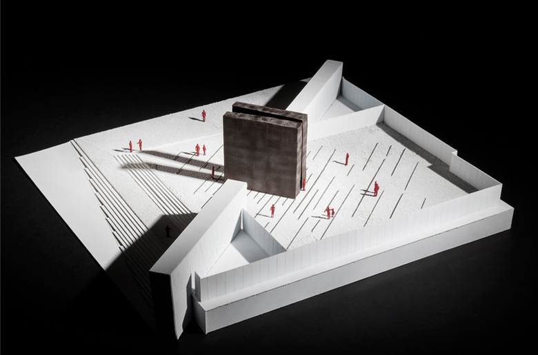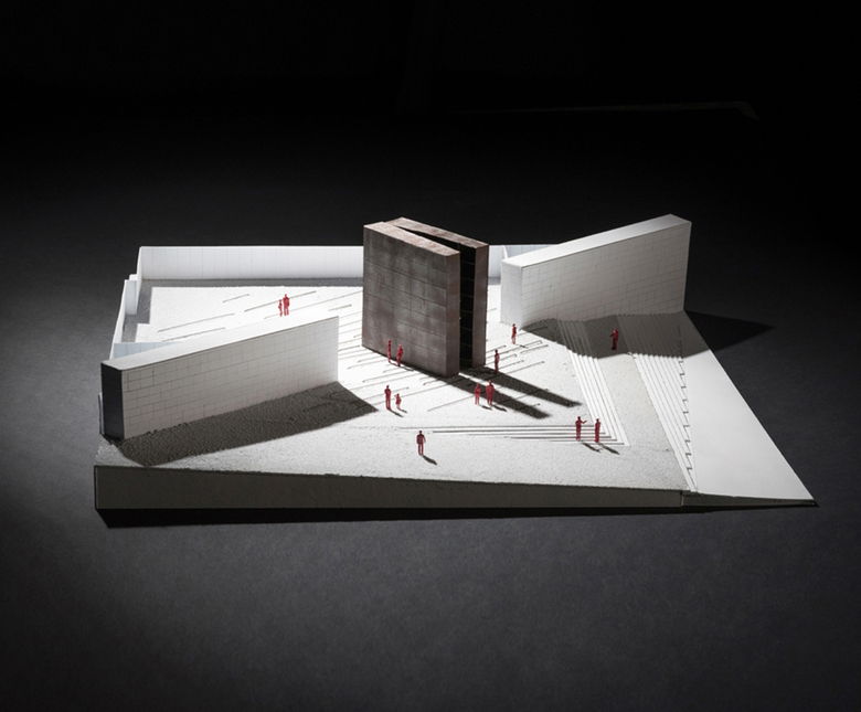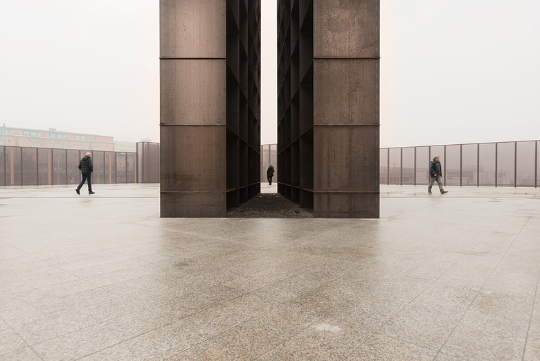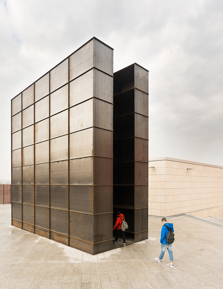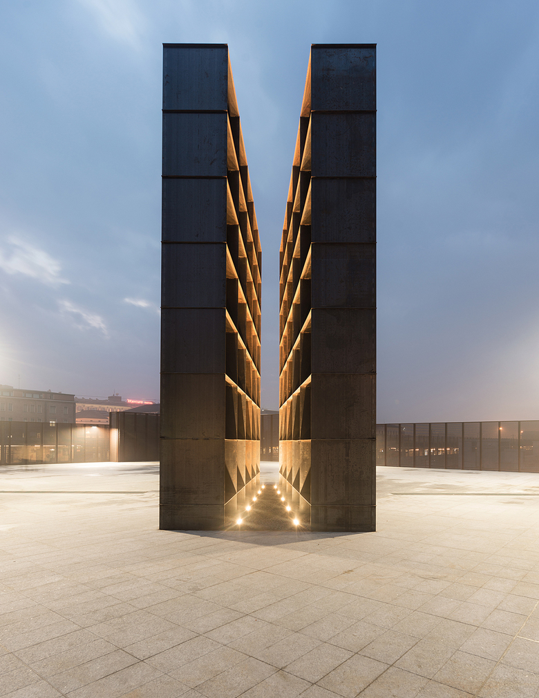 overlooks the city, resembling a blank page – perhaps it is of a history yet to be written? And, along the perimeter of the cells, slight steel protrusions symbolize feelings of contemporary awareness. The choice of cor-ten steel is deliberate: it is a material that will naturally rust when exposed to open air. As the years pass its corrosion will display the vestiges of time, demonstrating that all things have a rich history behind them. The paving of the path between the two blocks is realized in ballast, basalt stone chippings typical of the roadbeds. This represents the Judenrampe (“ramp of the Jewish”), which was the name given to the trek prisoners made from Auschwitz I (Stammlager concentration camp) and Auschwitz II (Birkenau