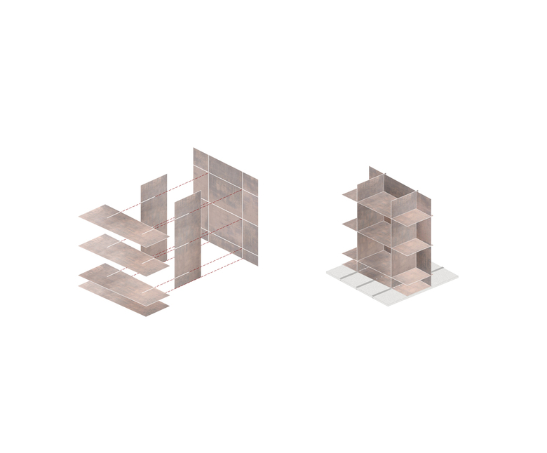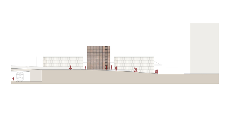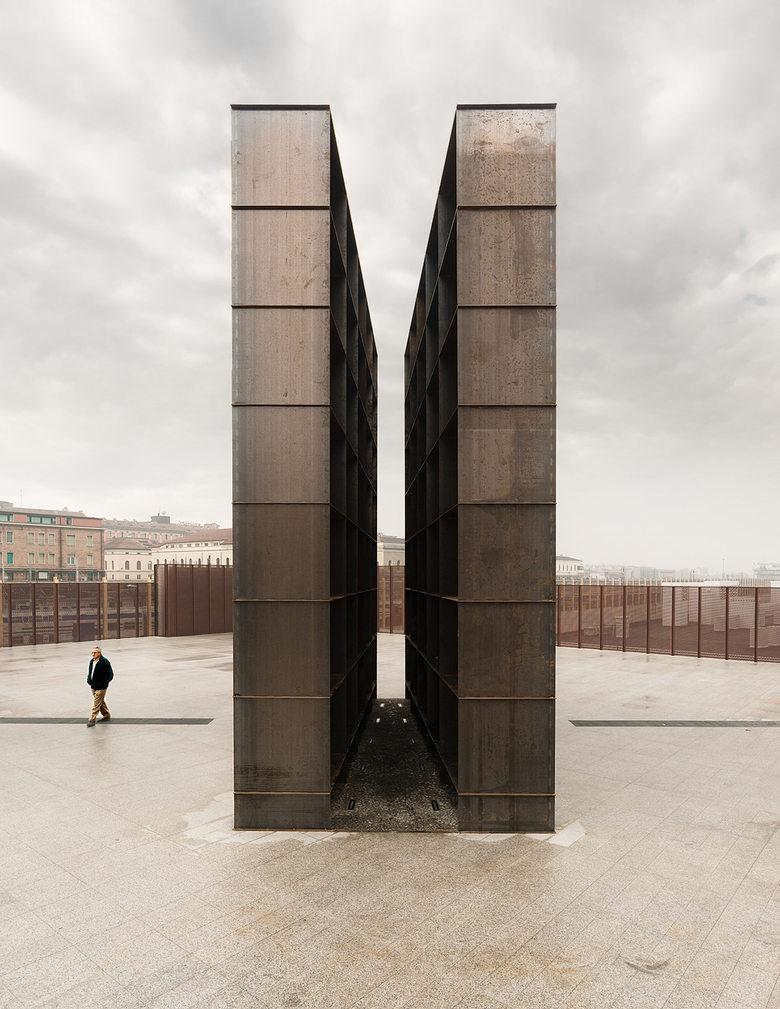 located at the intersection of Via dé Carracci and Ponte Matteotti, a city square encompassed by the newlyinstalled high-speed train station of Bologna. This area is primed to become the new connective pole of the city. As such, the monument attracts passers-by, inviting them to reflect on the tragedy of the Holocaust. The Memorial is made up of two symmetrical cor-ten steel parallelepiped blocks of 10x10m each; the blocks sit adjacent to one another, perpendicular to the existing walls of the square. Their position converges to create a path, which begins with a width of 1.60m, drastically narrowing to just 80cm. The path generates an immediate feeling of oppression. At the interior of the Memorial, the volumes present a grid of horizontal and vertical metal sheets which intersect at 90°, giving shape to a series of rectangular empty boxes of 1.80 x 1.25m – these boxes represent the cells of the dormitories in the concentration camps. The exterior façade of the Memorial