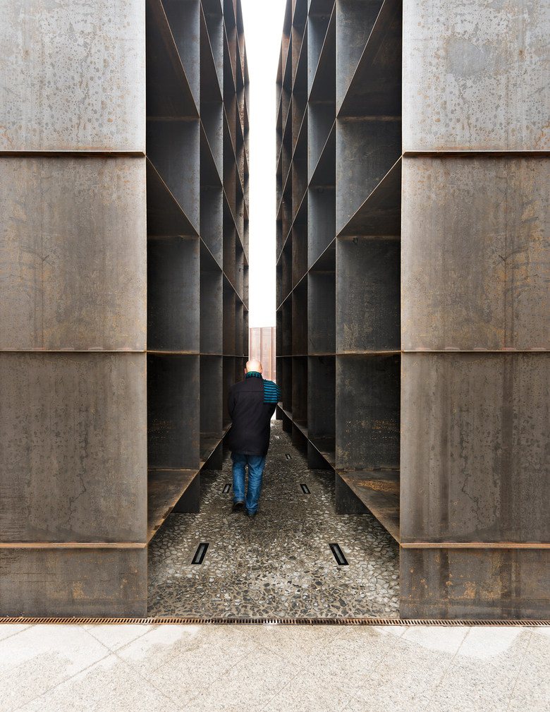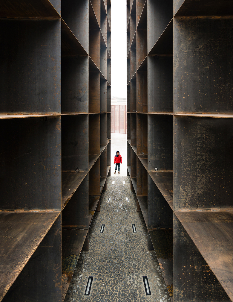 one). The empty echoes of footsteps across the stones coupled with the restriction of the passage instills a keen sense of anguish: in this way the Memorial takes on life and evokes the drama of the memory. Further, light plays an essential role in the culmination of the monument. During daytime when the square is lit by sun’s rays, the passage becomes immersed in a dim, contemplative light, allowing the visitor to calmly reflect. Then at night, strategically placed artificial light illuminates the primary volumes, magnifing the majesty of the Memorial. In total, the Memorial, distinguished by its historical ambition, abandons rhetorical and didactic conventions in order to emphasize the importance of emotions: in this way SET Architects succeeded in designing a monument that utilizes present sensibility to narrate the past.