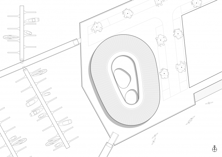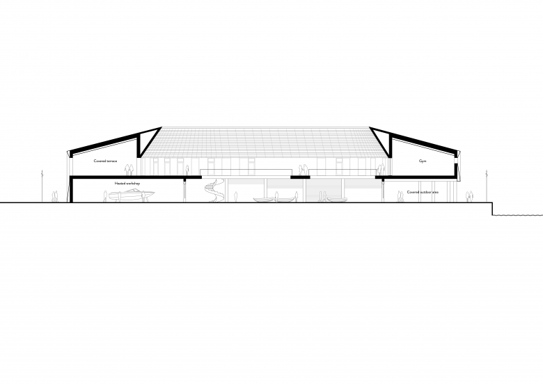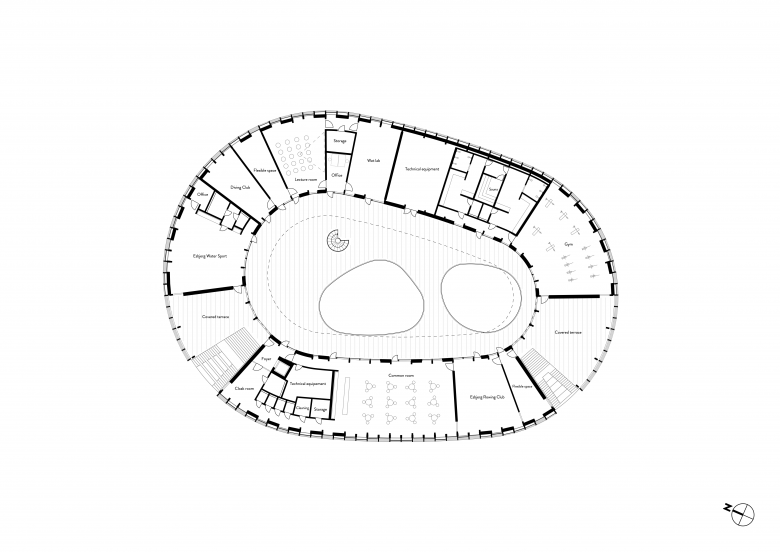 The upper level of the building houses various clubs, including clubs for rowing, kayaking, sailing, diving and triathlon, as well as common areas, an educational center and training facilities. On the lower level, directly connected to the sea by a bridge, one can find the boat storage and workshop space. Large windows throughout the building’s façade give plenty of daylight and visibility inwards, while also connecting the center to its surroundings. At night, a warm glow shines through the windows, lighting the center up like a lantern.