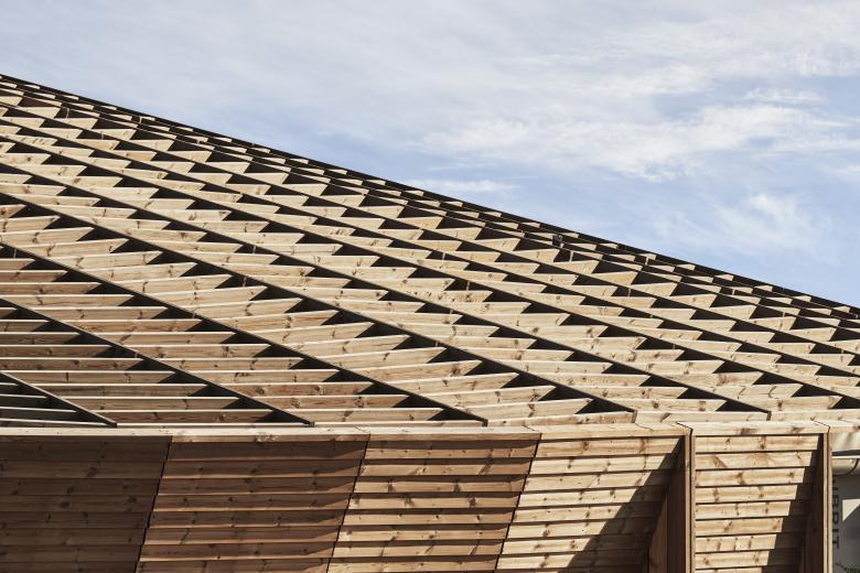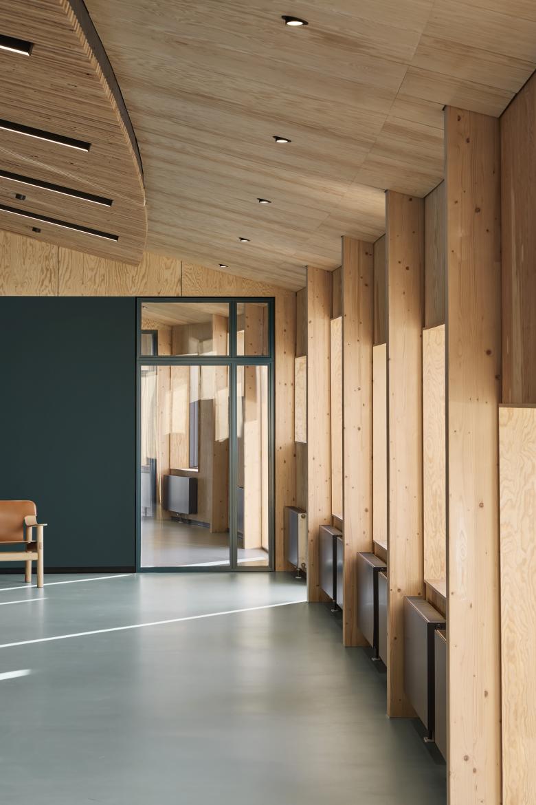 The façade has a rhythm and repetition inspired by wooden boat construction, both outside and inside. It also reflects the water's energy with the pace and horizontal rippling effect experienced when throwing a stone in the water. The changes in the angle of the panels give varying shadows, inspired by the shapes of kayaks. The wooden rhythm continues on the roof, where solar panels are integrated in a belt around the top edge.