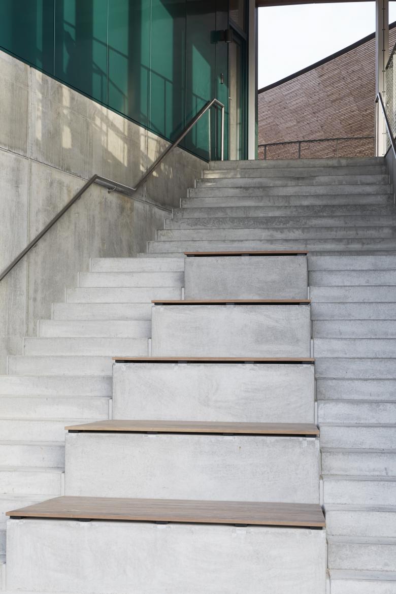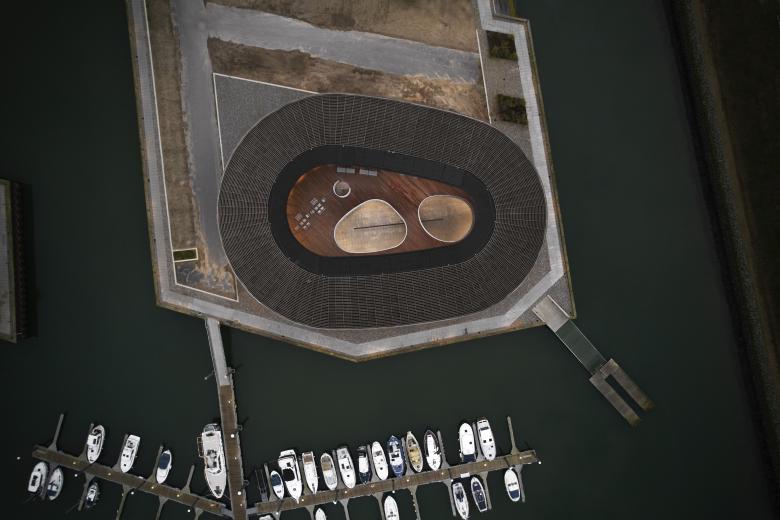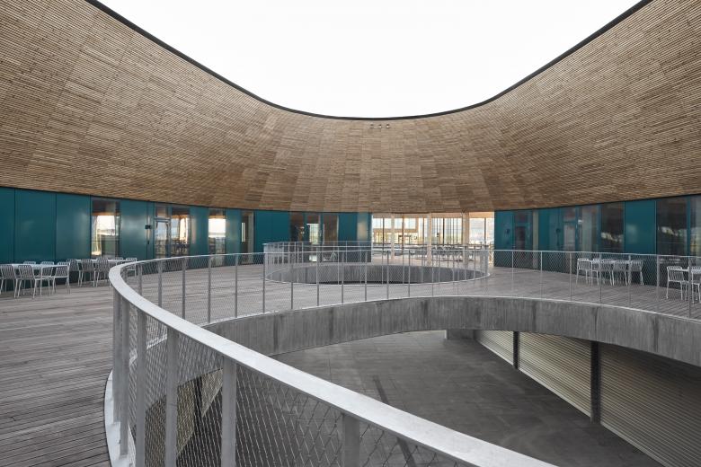One such area, and the heart of the project, is a lifted, publicly accessible terrace, gathering all the different activities of the building. Connected to the first floor, the terrace is accessible from the two main stairs, creating an amphitheater. Along these two amphi stairs, visitors can enjoy the view and the maritime activities on smaller wind-protected terraces on the first floot.
