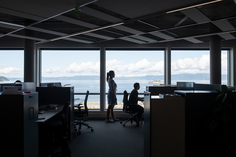 The Powerhouse prioritizes the physical comfort and well-being of the building’s occupants with strategies that balance its focus on fresh air and thermal comfort with extreme energy-efficiency. The ventilation system provides pleasant and clean air to the indoor spaces and accommodates Trondheim’s mild and humid climate. The office landscape contains technical installations for air supply that regulate ventilation. The air is let out close to the floor at low speed, while the extraction takes place centrally by suppression in the stair shafts. Further, the building’s structural system consists of thermal mass – low-emission concrete – which is exposed through strategic cutouts in the ceiling. The mass absorbs and retains heat and cold and helps regulate the temperature in the building without using electricity.