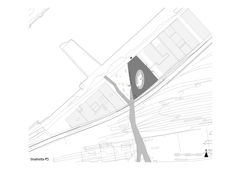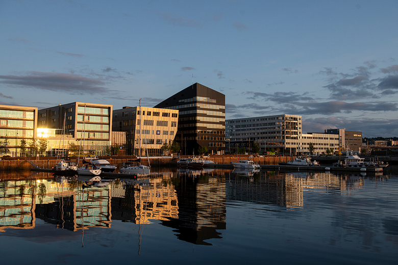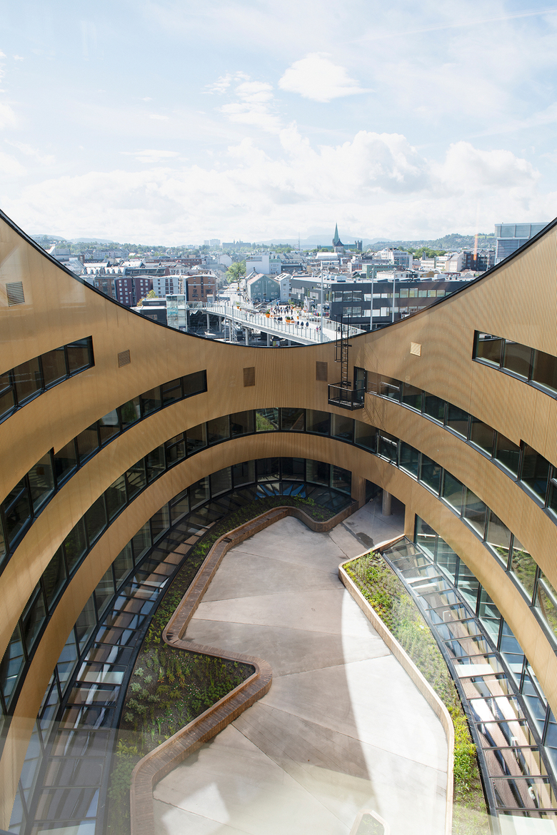 Powerhouse Brattørkaia is located in Trondheim, Norway, 63° north of the Earth’s equator, where sunlight varies greatly between the seasons. This presents a unique opportunity to explore how to harvest and store solar energy under challenging conditions. The 18 000 m^2 office building is situated by the harbor and connects to Trondheim Central Station via a pedestrian bridge on the rear end of the building. The waterfront façade is the slimmest face of the building, allowing the project to be read at a similar scale with its neighbors. Clad with black aluminum and solar panels, the façade is reflected in the adjacent Trondheim Fjord.