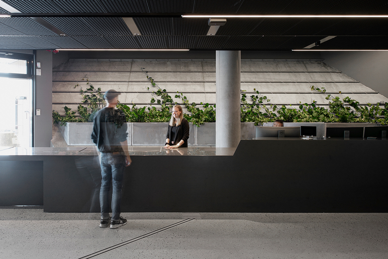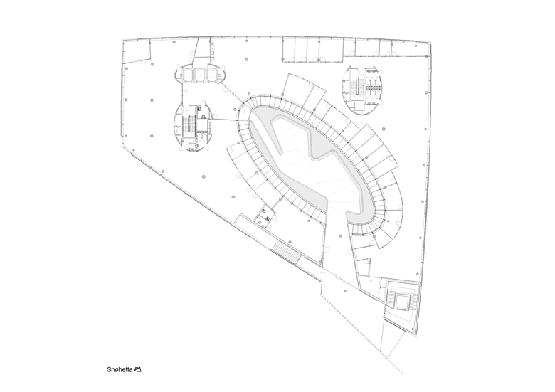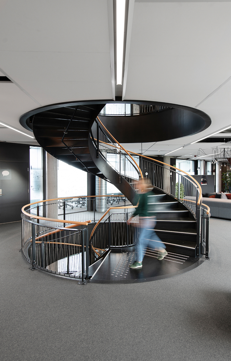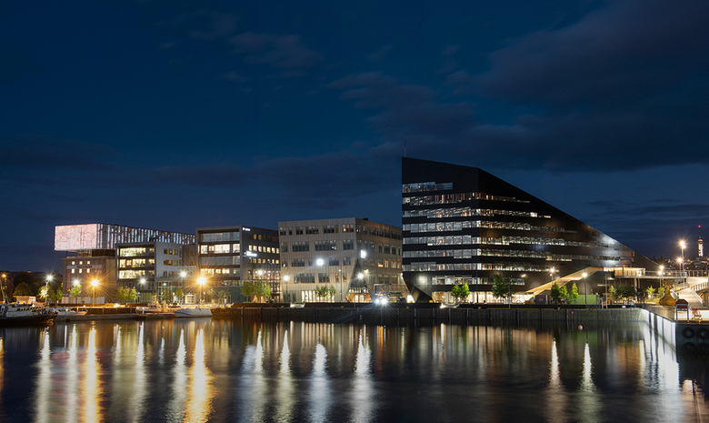 Viewed from the harbor front, the building façade’s sides cants inwards, bringing associations to how the building is bursting with energy. From the opposite approach, the sloping roof of the building reveals a cutout in the center of its plan that allows daylight to flow into the office spaces. Within this illuminated core is an atrium that functions as a public garden with horizontal glass windows on the sides, providing skylight into the below canteen. This skewed lightwell allows daylight to enter the building on every floor, and gives the people working inside a great view of the city. The atrium also limits the amount of artificial light needed inside the building. Large glass windows and pleasant open spaces flooded with daylight contribute a comfortable and inviting work environment.