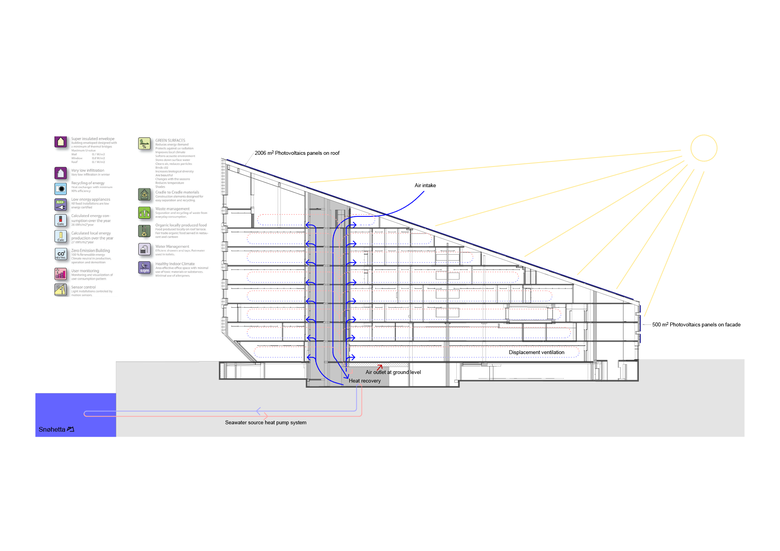 The building is extremely energy efficient, leveraging a series of technologies to radically reduce energy use for its daily operations. This is accomplished through insulating the building for maximum efficiency, installing intelligent solutions for air flow to reduce the need for heating, heat recovery solutions for ventilating air and greywater (wastewater from all sources except toilets), using seawater for heating and cooling and implementing only energy efficient electrical appliances. Daylight conditions are optimized throughout the building design and artificial light use is kept at a minimum.