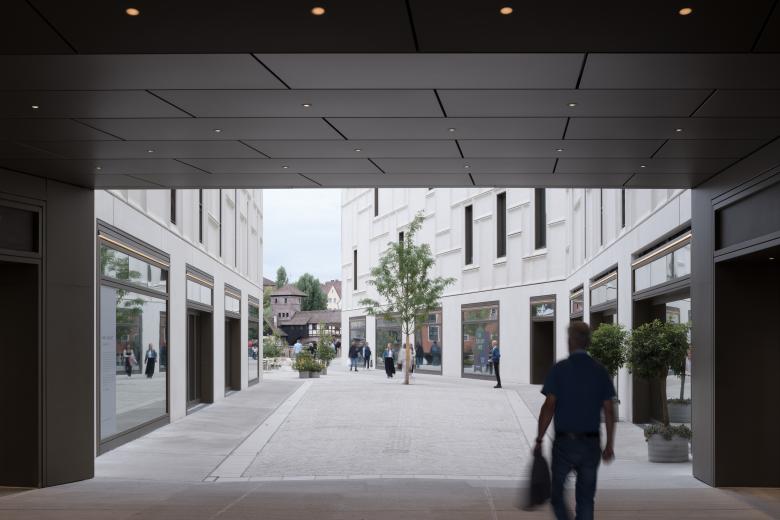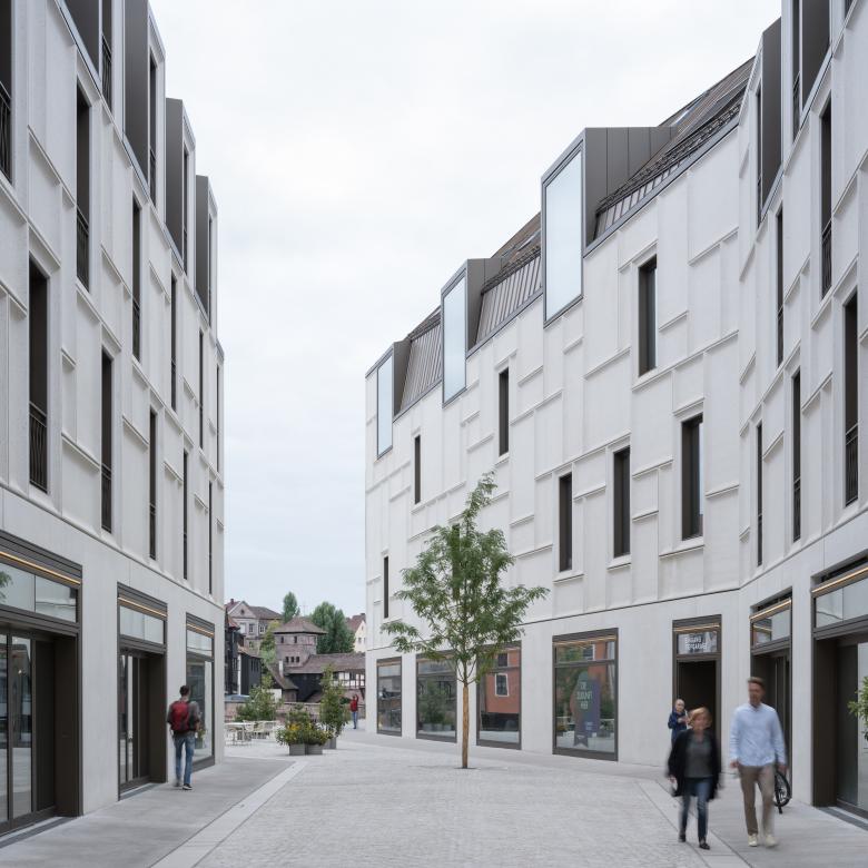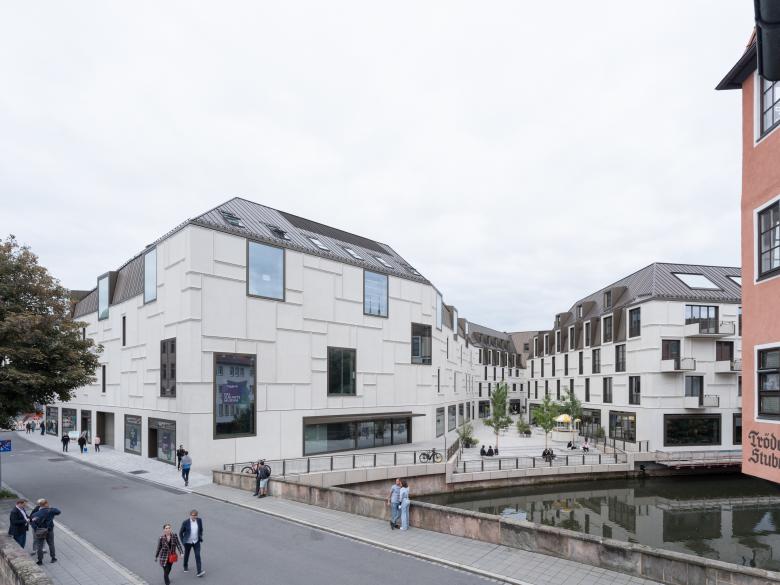 Das 5000 qm große Baugrundstück liegt malerisch an der Pegnitz, in Sichtweite des Nürnberger Altstadtmarktes. Die städtebauliche Figur der Bebauung wurde aus dem Maßstab der historischen Innenstadt entwickelt. Sie vervollständigt die angrenzenden Altstadtblöcke und lässt zwischen ihnen einen langgestreckten, leicht geschwungenen Hofraum entstehen, der vom Markt aus über ein breites Tor betreten werden kann und sich zum Ufer der Pegnitz hin öffnet. Nicht nur Passanten profitieren von dieser räumlichen Geste, sondern auch beinahe alle Nutzer des neuen Gebäudes. Die öffentliche Verbindung zur Pegnitz und zur Karlsbrücke erweitert das Wegenetz der Stadt und schafft eine ringförmige Verbindung zwischen der nördlichen und der südlichen Altstadtseite der Pegnitz.