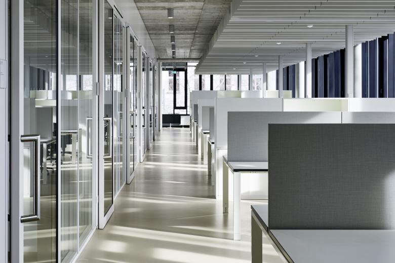 Die Grundrissstruktur des Institutsgebäudes trägt der interdisziplinären Arbeitsweise und der gewünschten Kommunikation zwischen den wissenschaftlichen Arbeitsgruppen Rechnung. Ein alle Geschosse verbindender Luftraum mit skulpturaler Wendeltreppe stellt das prägnante Zentrum des Gebäudes dar, das der Erschließung und der Orientierung dient und als interner Treffpunkt zur Kommunikation einlädt. Hier liegen die Besprechungs- und Aufenthaltsräume sowie die Teeküchen. Da die Wissenschaftler programm- und disziplinübergreifend forschen und sowohl experimentelle als auch mathematische An- sätze verfolgen, kommen im Institut klassische experimentelle molekularbiologische Laborarbeitsplätze mit rechnerintensiven bioinformatischen und theoretischen Arbeitsplätze zusammen, wobei die Anteile der jeweiligen Arbeitsplätze je Arbeitsgruppe variieren und flexibel anpassbar sind.