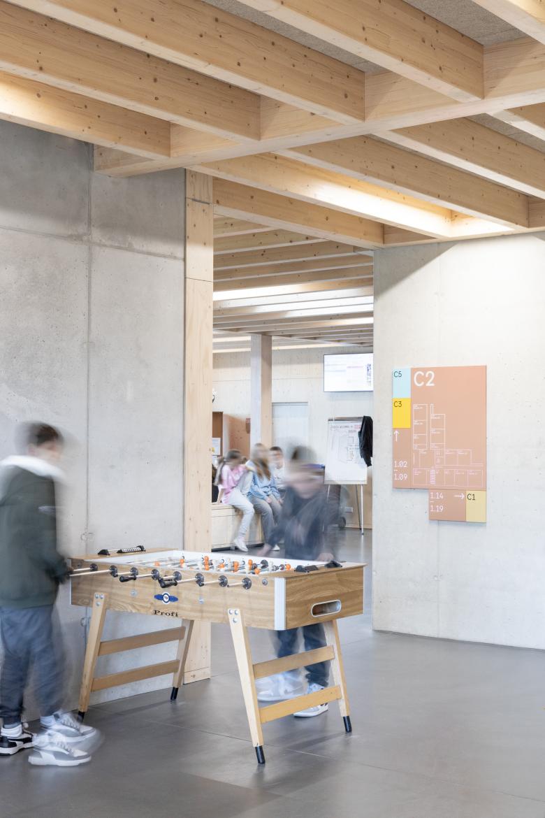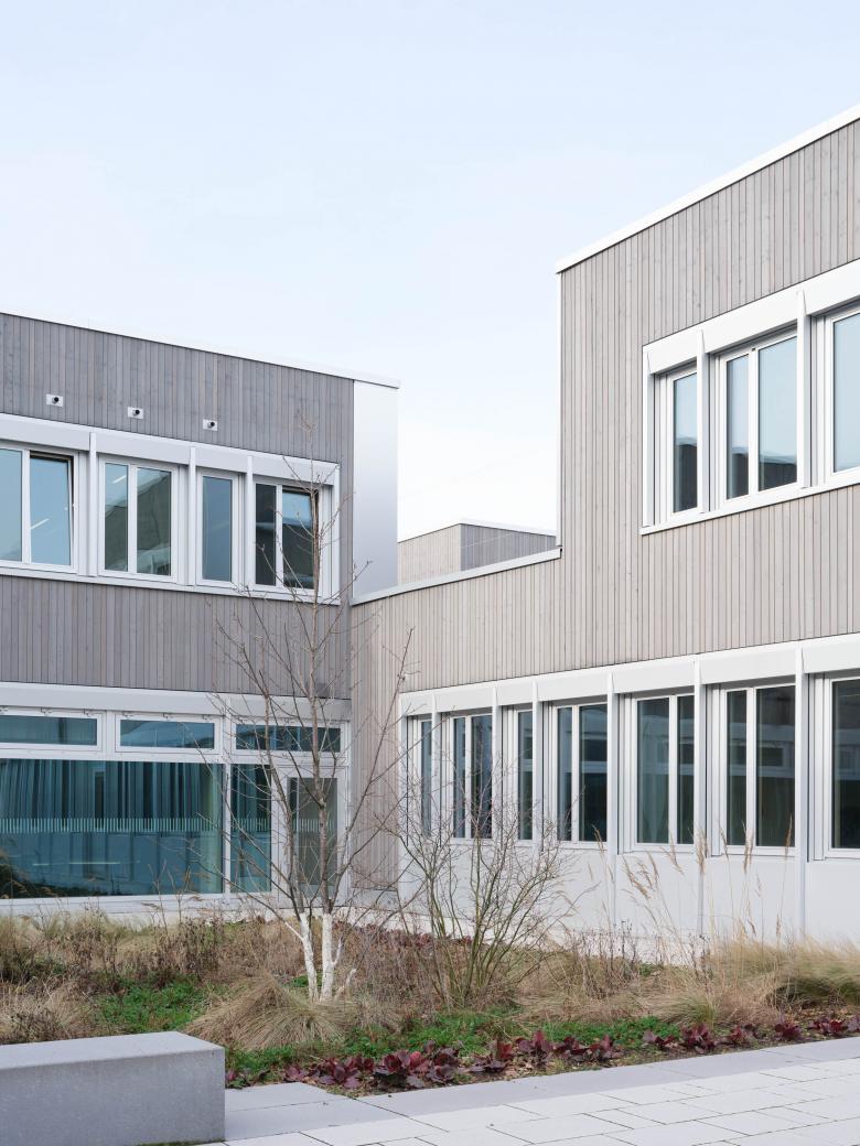 Die musikbetonte Clayschule ist eine von drei Pilotschulen Berlins, in der exemplarisch neue räumlich-didaktische Konzepte und nachhaltige bauliche Lösungen erprobt werden. Das Gebäude unterstützt mit einer Mischung aus klar zugewiesenen Bereichen und einer flexiblen Raumstruktur das innovative Schulkonzept und erlaubt ihm, über die Jahre lernfähig zu bleiben. In einem heterogenen Umfeld aus Gewerbezonen und unterschiedlich verdichteten Wohngebieten behauptet sich die Schule als kräftiger Solitär. In den Baukörper sind drei großzügige Lichthöfe eingeschnitten, die das Gebäude strukturieren und belichten. Im Erdgeschoss befinden sich die gemeinsam genutzten Bereiche der Schule wie die Aula, die Mensa, der Ganztagsbereich und die Fachklassen. Eine innere Schulstraße verbindet alle Gemeinschaftsbereiche und leitet die Schüler über verglaste Treppenräume in die Lern-Cluster im Obergeschoss. Die jahrgangsweise organisierten Bereiche begleiten die Schüler über die gesamte Schulzeit und werden durch große Lernterrassen gegliedert und aufeinander bezogen. In der umlaufenden Klinkerfassade bilden tiefliegende Fensterbänder die inneren Funktionen ab. Die eingeschnittenen Terrassen und Innenhöfe erhalten leichte Pfosten-Riegel-Fassaden aus Holz und Glas, die den Charakter der Lernbereiche bestimmen. Alle Materialien zeichnen sich durch eine große Robustheit, ein gutes Alterungsvermögen und einen geringen Wartungsbedarf aus.