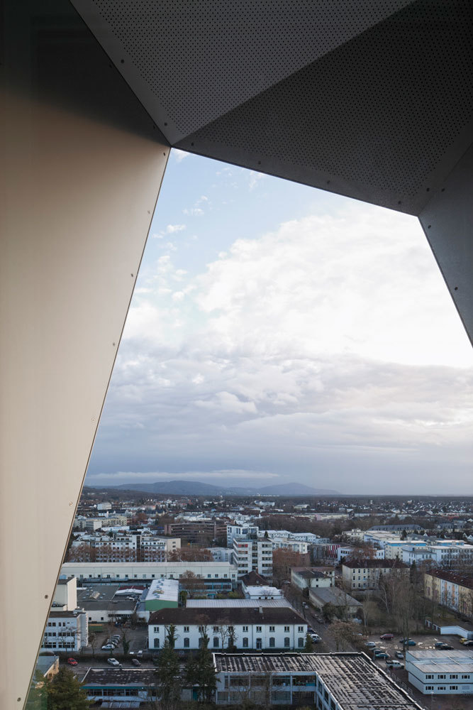 Die geometrische Ausgestaltung der feststehenden, wartungsarmen Sonnenschutzelemente wurde aus den Vorgaben einer Simulationsberechnung zum Sonnenverlauf in Zusammenarbeit mit dem Büro Transsolar entwickelt.