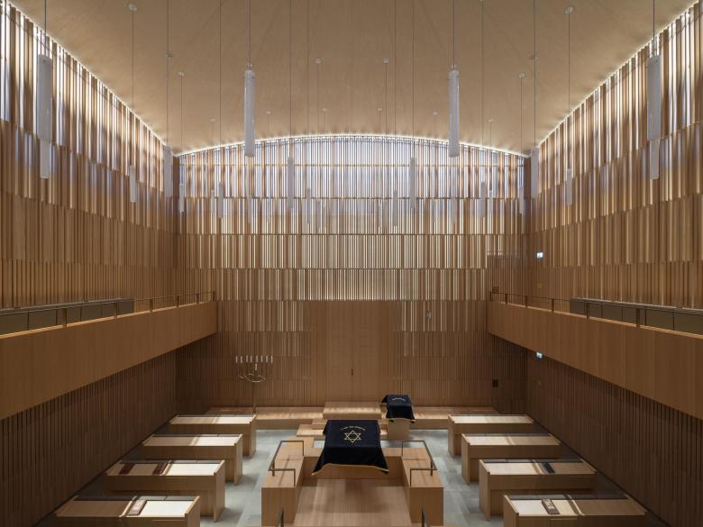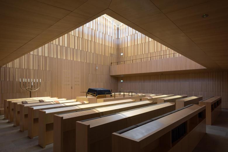 Besondere Sorgfalt wurde auf die Gestaltung der Synagoge gelegt, die städtebaulich wirksam an der die Süd-Ost-Ecke des Neubaus positioniert wurde. Der ruhig proportionierte Raum erhielt eine zweite, nach Osten ausgerichtete Holzschale, deren Lamellen den Verlauf des Sonnen- und Tageslichts gedämpft in den Innenraum übertragen und dem überwölbten Synagogenraum bei aller Schlichtheit eine hohe meditative Qualität geben.