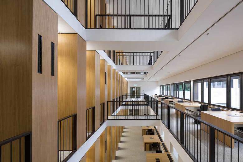 Aus einem erdgeschossigen Sockel, der alle Teile des Gebäudes über einen Kreuzgang zusammenbindet, werden für die unterschiedlichen Institutsbereiche mehrgeschossige Baukörper entwickelt. Die Anordnung und Orientierung dieser Baukörper richtet sich nach den funktionalen und räumlichen Anforderungen der verschiedenen Funktionsbereiche. So riegelt das Freihandmagazin gleichsam als Lärmschutzwand den Blockinnenbereich von der viel befahrenen Hansaallee ab. Die dazu gehörigen Büroarbeitsplätze sind in den ruhigen Innenhof orientiert. Die Projektbüros liegen zum Park nach Süden ausgerichtet, mit Blick auf das zentrale Gebäude der IG Farben. Der Wohnbereich liegt in der nordwestlichen Ecke des Grundstückes, und orientiert sich mit seinen Wohnräumen ebenfalls in den Hof.