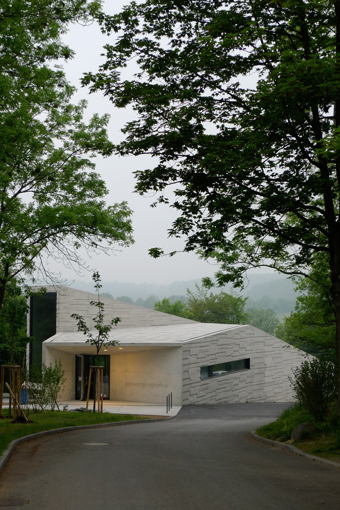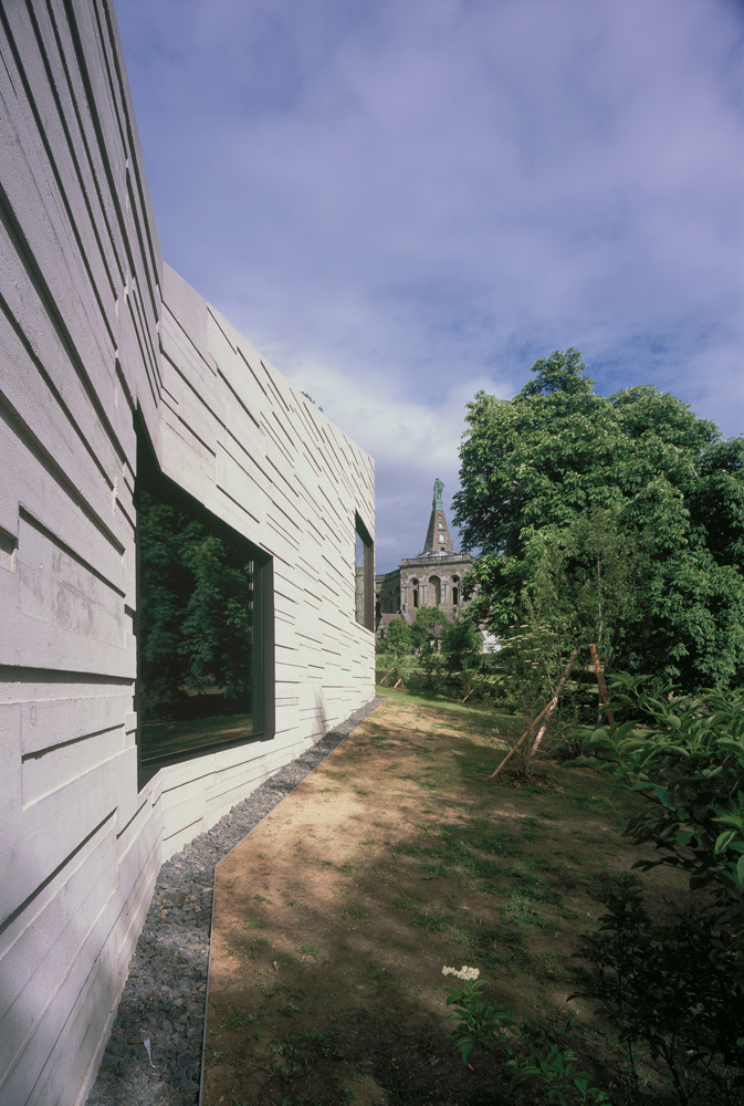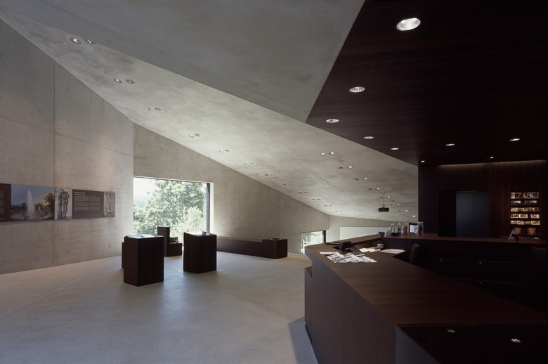 Als Teil der Topografie besteht das Gebäude innen wie außen aus Sichtbeton. Dieses Material bestimmt auch die von allen Aufbau- ten freigehaltene Dachaufsicht, die vom Herkulesdenkmal einsichtig ist. Die Außenhaut nimmt mit ihrer groben Reliefstruktur das poröse Felsgestein des Herkulesbauwerkes und der natürlichen Umgebung auf, während im Inneren des Gebäudes der Sichtbeton eine weiche und glatte Oberfläche erhält.