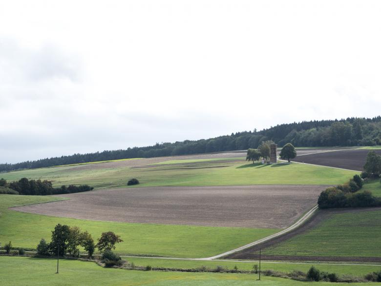 Eine Wegkapelle zu errichten, ist eine seltene Bauaufgabe. Für das Projekt 7 Kapellen wurden sieben Architekten von der Siegfried und Elfriede Denzel Stiftung beauftragt, zeitgemäße Holzkapellen entlang den neu entstandenen Radwegen in der Gegend zu entwerfen, die gleichermaßen Wegmarken und Orte der Begegnung und Einkehr sind. Als Besonderheit konnten die Architekten den Ort der Kapelle selbst auswählen. Wir entscheiden uns für einen kleine Baugruppe inmitten von Feldern an einem leichten Hang über Kesselostheim.