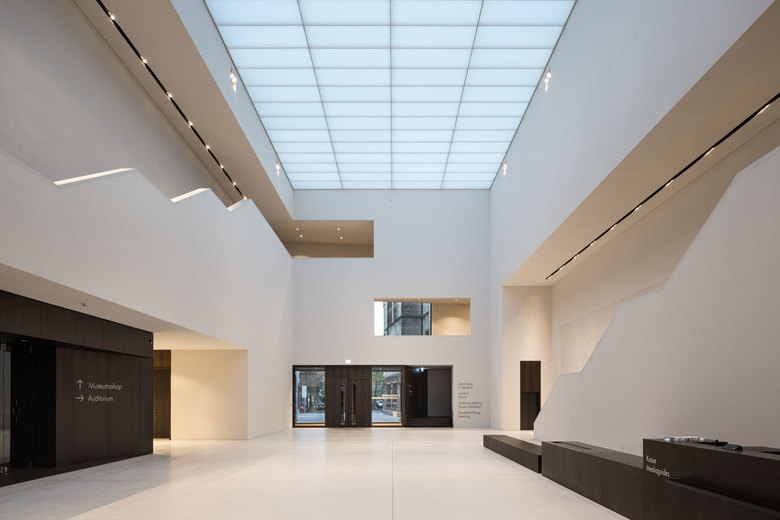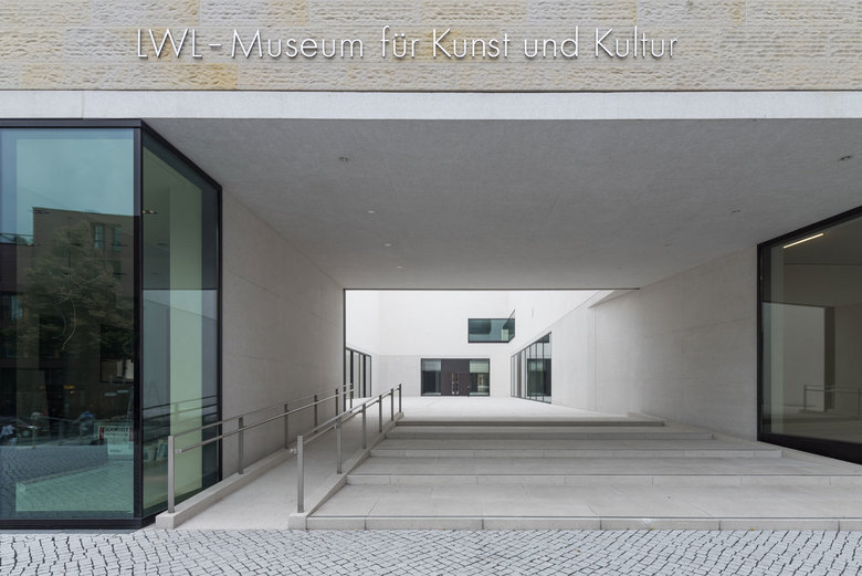 Der Neubau des Museum schließt an den Neorenaissance-Altbau am Domplatz an und ist in die öffentliche Wege der Stadt vernetzt. Um die Grenzen zwischen Stadt und Museum fließend ineinander übergehen zu lassen, wurde eine Sequenz von vier öffentlichen Räumen entwickelt, welche in ihrem Charakter zwischen Vorplatz, Eingangshof, Patio und überdachtem Foyerraum variieren. Entsprechend der städtebaulichen Zielsetzung sind die öffentlichen Funktionen wie Gastronomie, Buchladen, Bibliothek, Vortrags- und Veranstaltungsbereich und Westfälischer Kunstverein im Erdgeschoss organisiert. Im Inneren galt es ein Erschließungssystem zu entwickeln, welches den historischen Altbau sinnfällig und niveaugleich in den chronologischen Rundgang mit einschließt und die separate Erschließung des Wechselausstellungsbereichs ermöglicht. Mit unterschiedlichen Raumproportionen entstehen abwechslungsreiche Raumsequenzen, die durch definierte Ausblickräume auf städtische und innenräumliche Situationen, rhythmisiert werden.