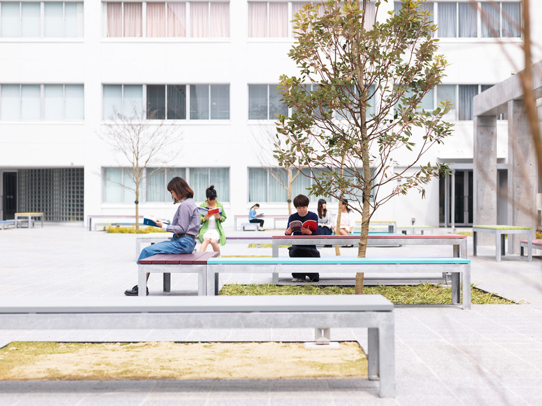 We have dotted the open area with trees that create shade and colorful benches of varying heights. Align them, link them, stack them, the benches can be arranged to cater for various activities on campus. The students can eat, talk, read, study, or even take a nap on the benches. The colors of the benches and their applications were co-designed with the students themselves. The students learn design concepts by creating an area and then observing how their area is used by other.