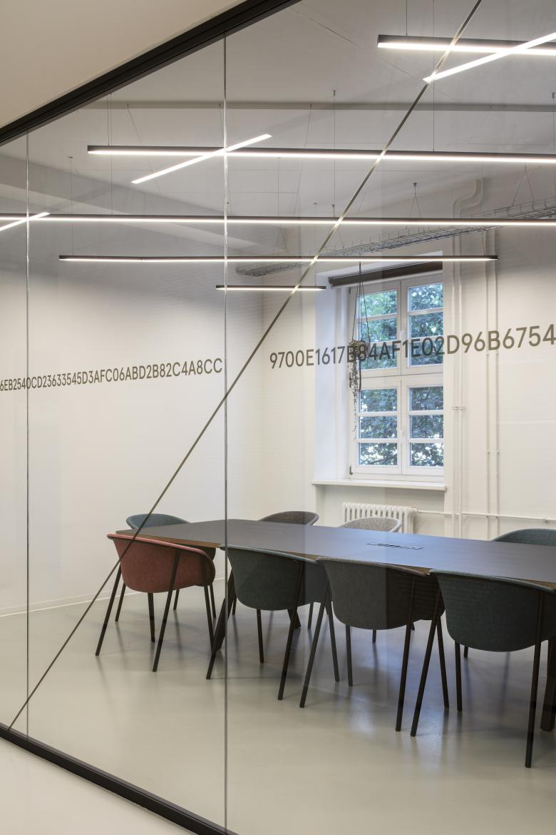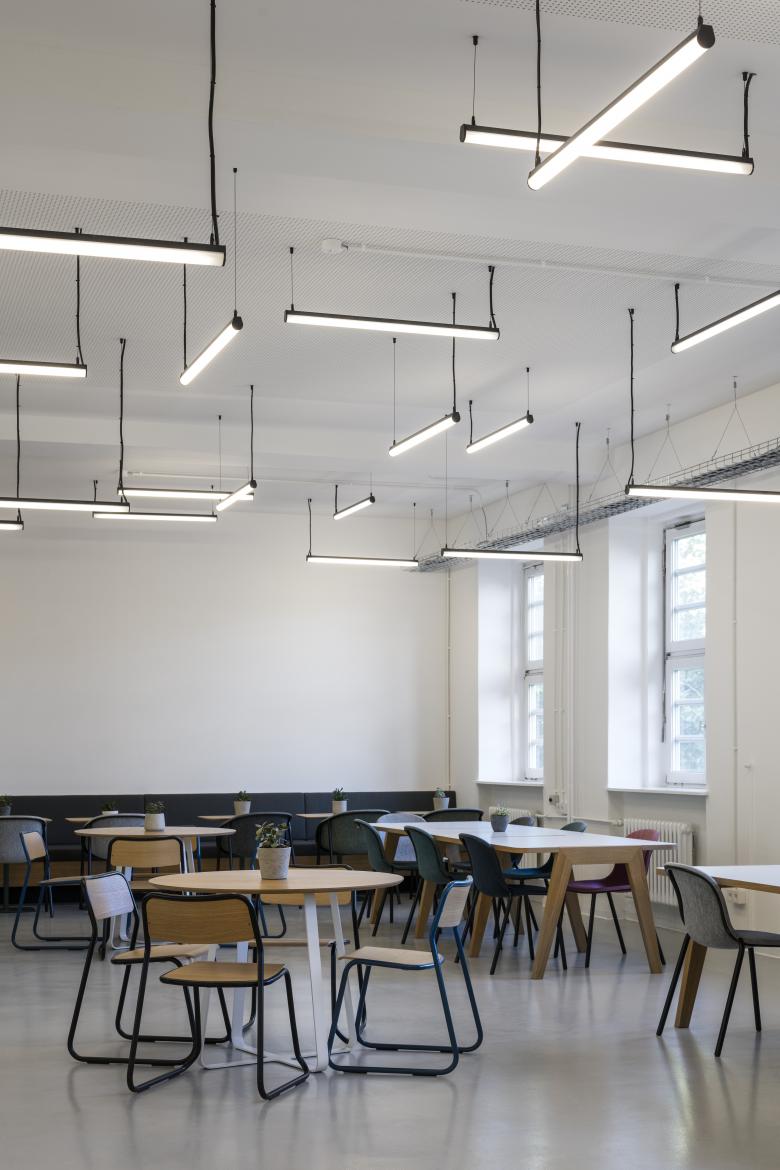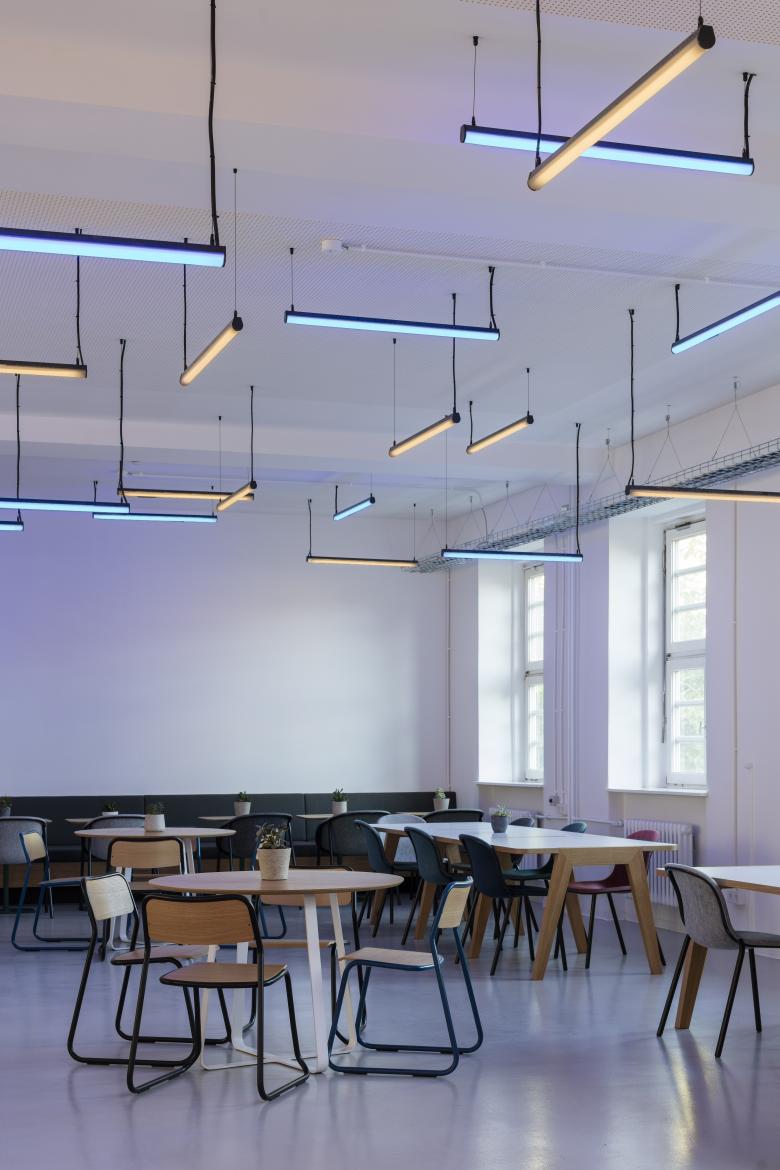 The meetup and café spaces needed versatile lighting: catchy for events but at the same time suitable for conferences and workshops. These requirements were fulfilled by setting different, easily controllable lighting scenarios. The RGBW light lines hang in different heights and directions, playing on the concept of the innovative and digital businesses who inhabit this office space.