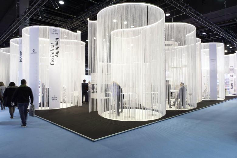 The exhibition stand for the "Office of the Future / Flexibility" at the Frankfurter Fair for Paperworld 2019 was designed and curated by the architectural firm MTTR. The brief to Studio De Schutter was to consult the architects on the lighting, and co-develop a lighting concept in line with their vision and the fair in general.