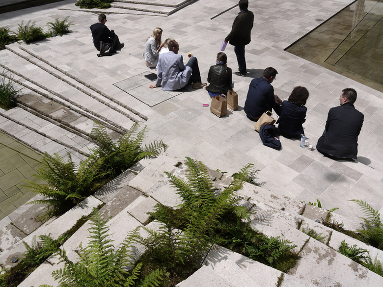 Die Ruhe hat etwas Fremdes, etwas Intimes und dadurch Irritierendes. In die plötzliche Stille mischt sich ein Plätschern, ein Glitzern im Wasser oder ein leicht modriger Geruch von Moos und Farn. Der Raum offeriert den Luxus eines sinnlichen Erlebnisses, eines Innehaltens inmitten einer immer fortschreitenden Arbeitswelt. Die Ruhe spiegelt sich in der Reduktion der Gestaltungsmittel auf Stein, Wasser, Farn und, bei genügend Geduld, einen langsam wachsenden Moosteppich sowie dem bewussten Verzicht auf sonst übliche Möblierungen aller Art.