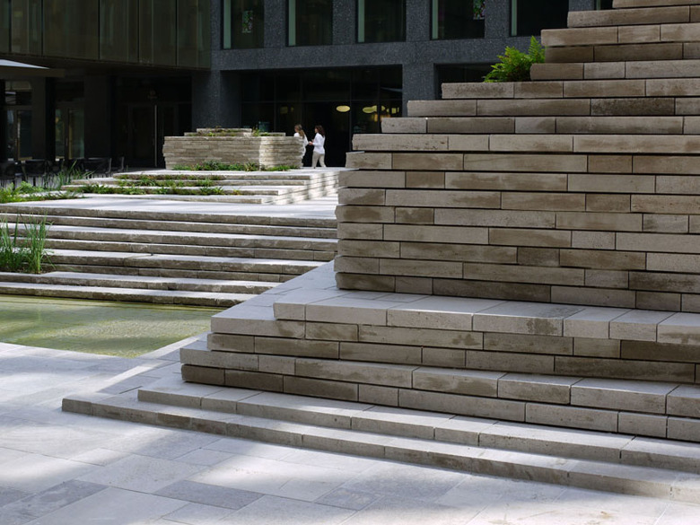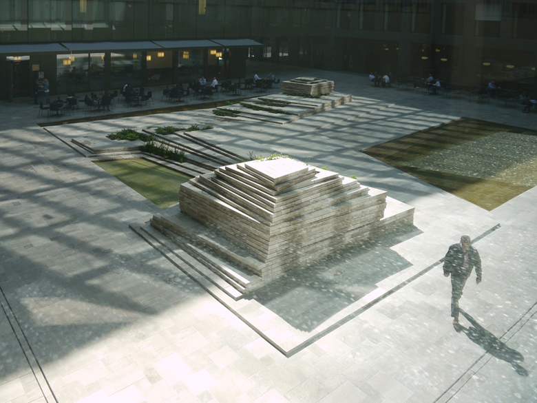 Über eine Schichtung von gesägten und gebrochenen Muschelkalk-Platten entsteht das Bild einer steinernen Wasser- Landschaft, deren Massstäblichkeit sich je nach Blickwinkel ändert. Von Innen schafft sie, gefasst durch die mächtigen Fassaden, eine begeh- und besitzbare, räumlich differenzierte Miniatur eines moosigen Fels-Reliefs. Demgegenüber entsteht im Aufblick das abstrakte Bild einer Schollen-Landschaft, deren Ausdruck sich permanent über die Lichtreflexionen wandelt.