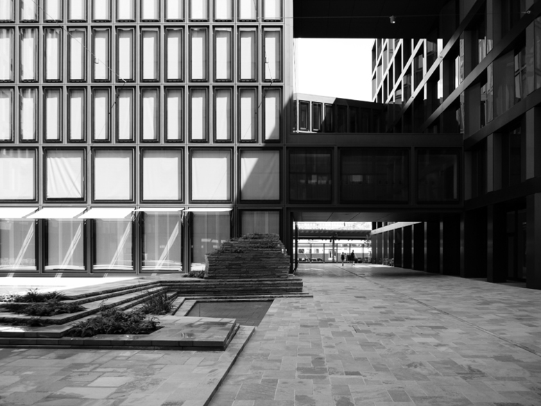 Der Kern des Hofes, ein fast sakraler Raum mit den kompakten Massen eines Raum-Würfels von ca. 30x30x30 Metern, wird geformt durch unterschiedliche Fassaden-Architekturen, die sich in ihrer Materialität und topographischen Gestaltung stark voneinander unterscheiden. Deren Oberflächen stehen im Wechselspiel zum hellen Muschelkalk-Boden mit dessen eingelassenen Wasserbecken. Der stetig wechselnde Lichteinfall bespielt diese Flächen mit unterschiedlichen Reflexionen und gibt dem Raum dadurch etwas Bühnenhaftes. Die Kompaktheit des Raumes und die spürbare Materialität der Oberflächen schaffen einen Raum von geradezu physischer Präsenz, der sich der Geschäftigkeit des Stadtquartiers entzieht. Er sucht die Differenz zur Umgebung und schafft etwas was es nicht gibt im öffentlichen Raum - der Hof schafft Ruhe.