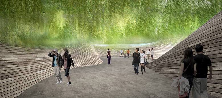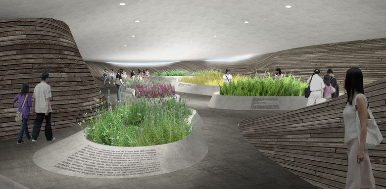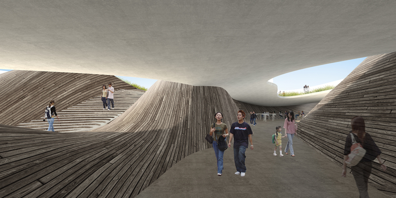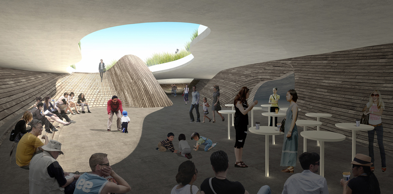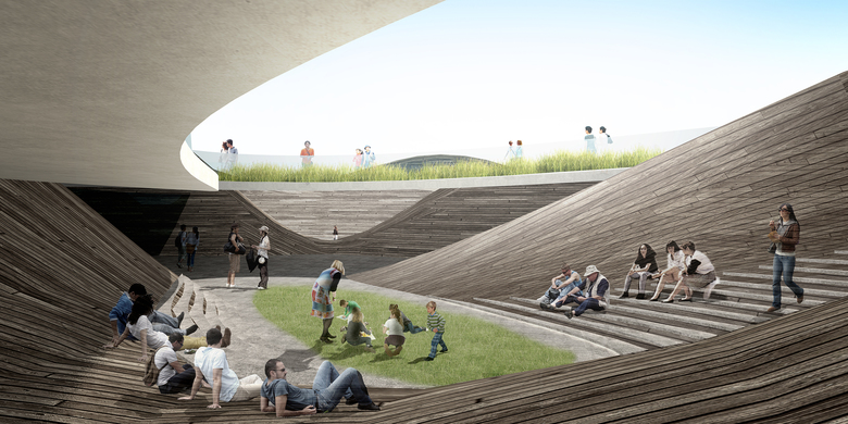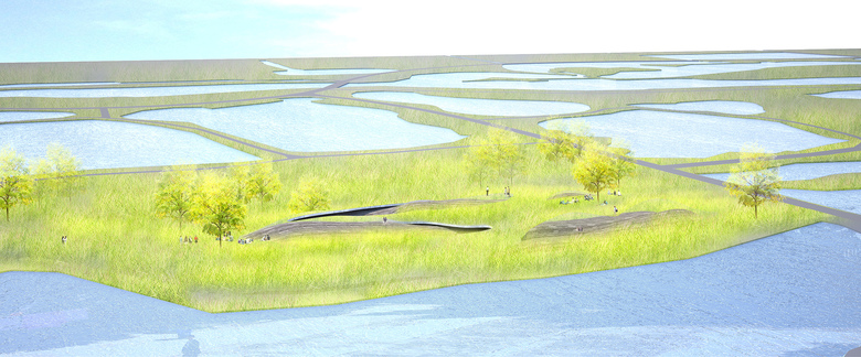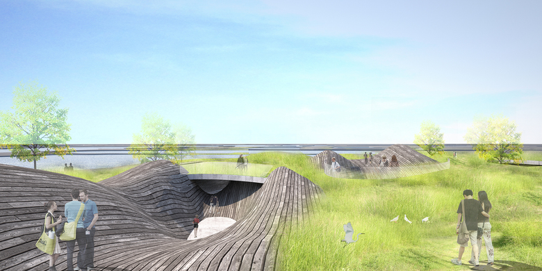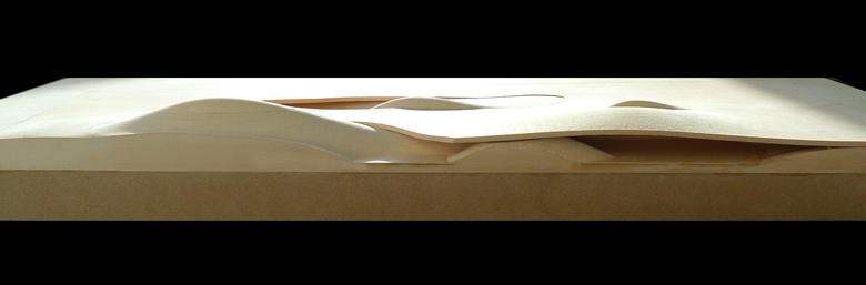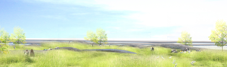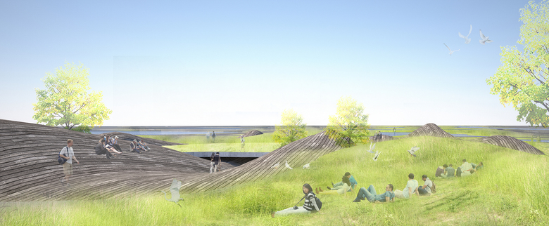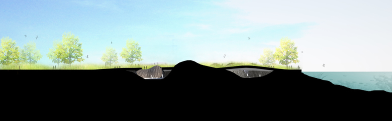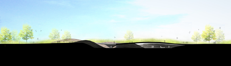 In a cross between architecture, landscape, and sculpture we look to recreate this wetland intersection between waterline and ground. Challenging the typical relationship between roof and floor, we partially submerge the museum underneath the ground plane. Covered by a subtle green roof, the visitors approach is only marked by three sets of undulating sculptural mounds. Appearing smaller than it is the mounds seem to grow as the visitor is pulled closer into the interior. Reaching a maximum height of 4 meters, the scaleless quality of these soft sloping forms creates an environment that is natural yet still some surreal. When the visitor reaches the foot of the sculpture, they realize it its base reaches past the ground plane through openings in the grass field.