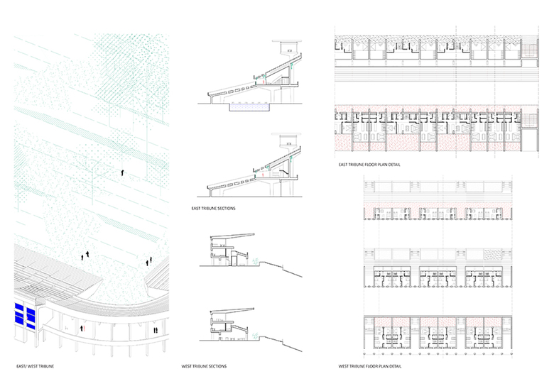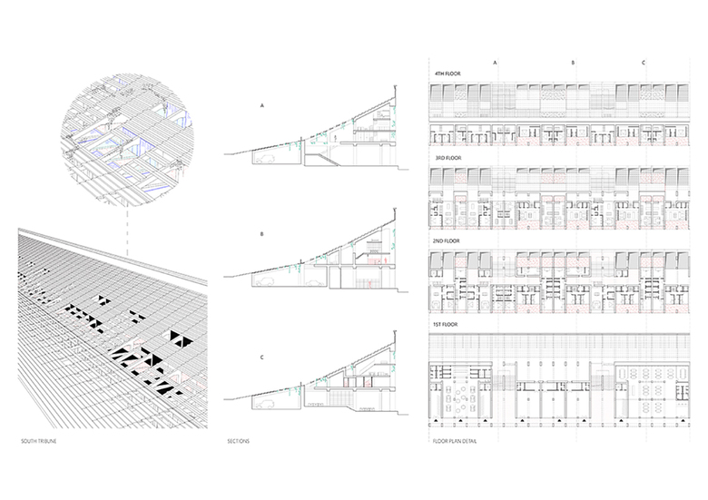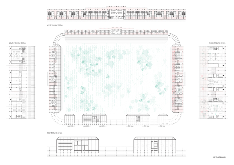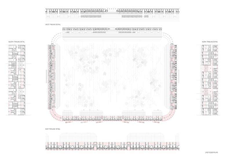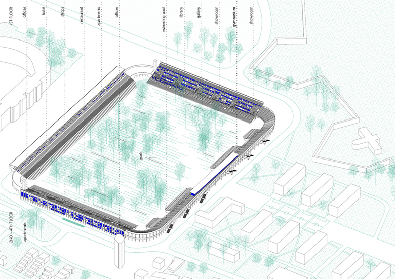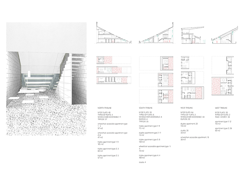 Housing in the tribunes of the Strahov stadium. View, location. The upscale nature of the accommodation is reflected in its price and saves, transforms and revitalizes this historical landmark. New type of accommodation, new inhabitants, meeting together, forming the city anew. The stadium surface. Enclosed empty space. Park as a legacy to the original purpose of the stadium – mass parades always presenting a specific ideology. Both the Sokol gatherings and the Spartakiads followed strict rules and embodied order. Groups of performers are symbolized in the park, their structure disrupted by routes of permeability, although they lack a solid boundary.The park serves as a meeting point between the past and the present. The basic principle of the design was to respect the current state of the stadium and to protect its visual features. Therefore, all the newly designed volumes are lined up with the boundaries of the stands as they are. The existence of windows orientated towards the park is made possible by removing several original concrete panels set upon the construction frames. The remaining panels serve as shades.
