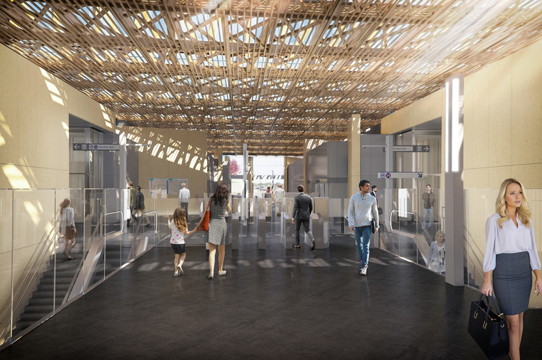 The station can be easily identified thanks to its singular roof: an horizontal evolution punctuated by a nonchalant rhythm produced by the walls. Wood is the material used for the structure and its underneath, while a wide cover will bring a specific atmosphere to the station’s lobby aiming directly at the senses.