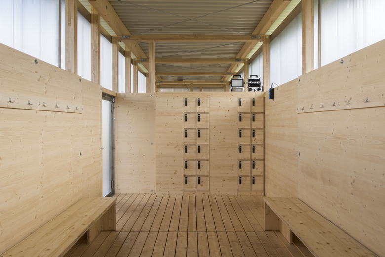 Der Pavillon,als mobile Konstruktion konzipiert. Er wird im Frühjahr auf- im Herbst wieder abgebaut und in Einzelteilen mit den Sportgeräten im Lagergebäude gelagert.
