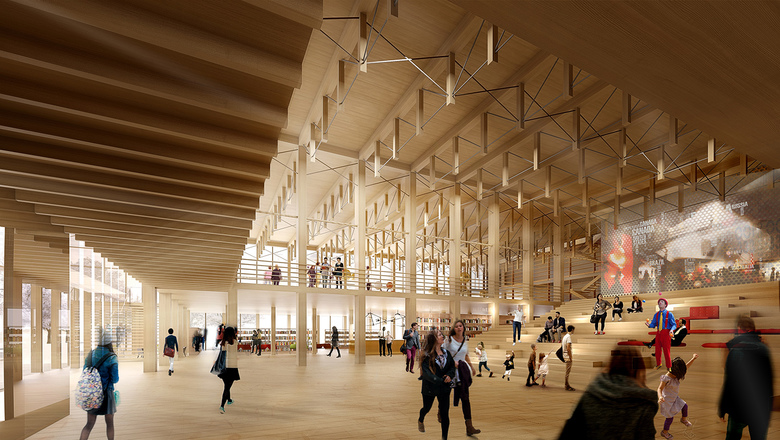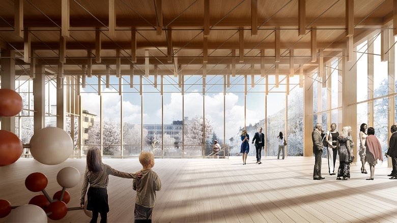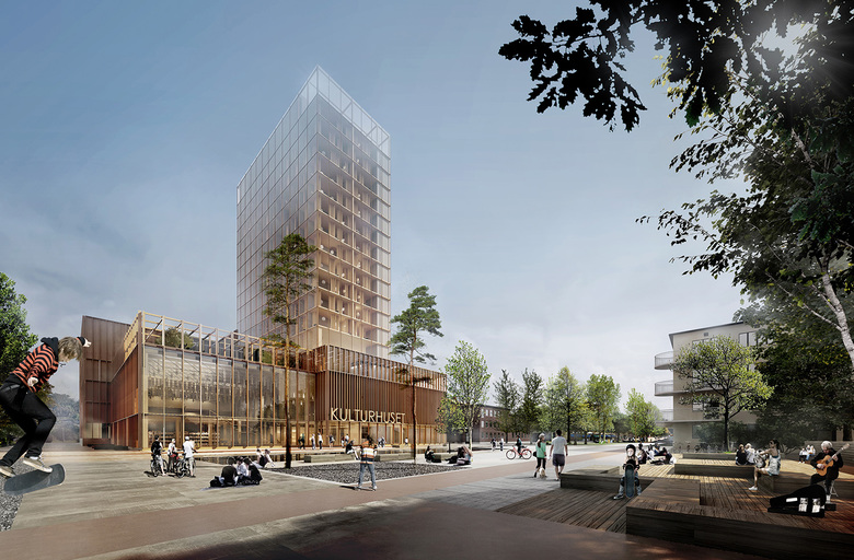 The venue will be the tallest building using wood frame construction techniques in the Nordic countries, allowing for views from the hotel rooms which stretch for miles. With a stage located in the middle of the venue and with different functions visible from the outside, the centre will breathe new life into the city. The ground floor will have multiple entrances to create a dynamic lobby and contribute to life of the city centre.